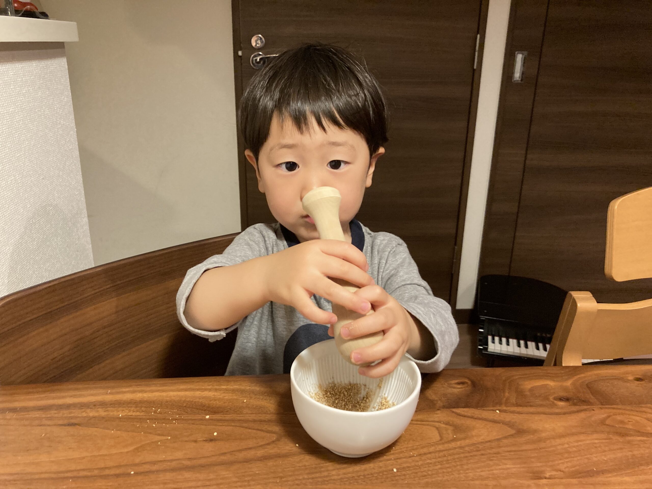 ごまをする際に準備するすり鉢とすりこぎですが、離乳食作りの際に利用していた小さなすり鉢とすりこぎが、こどもの小さな手にはぴったりでした。