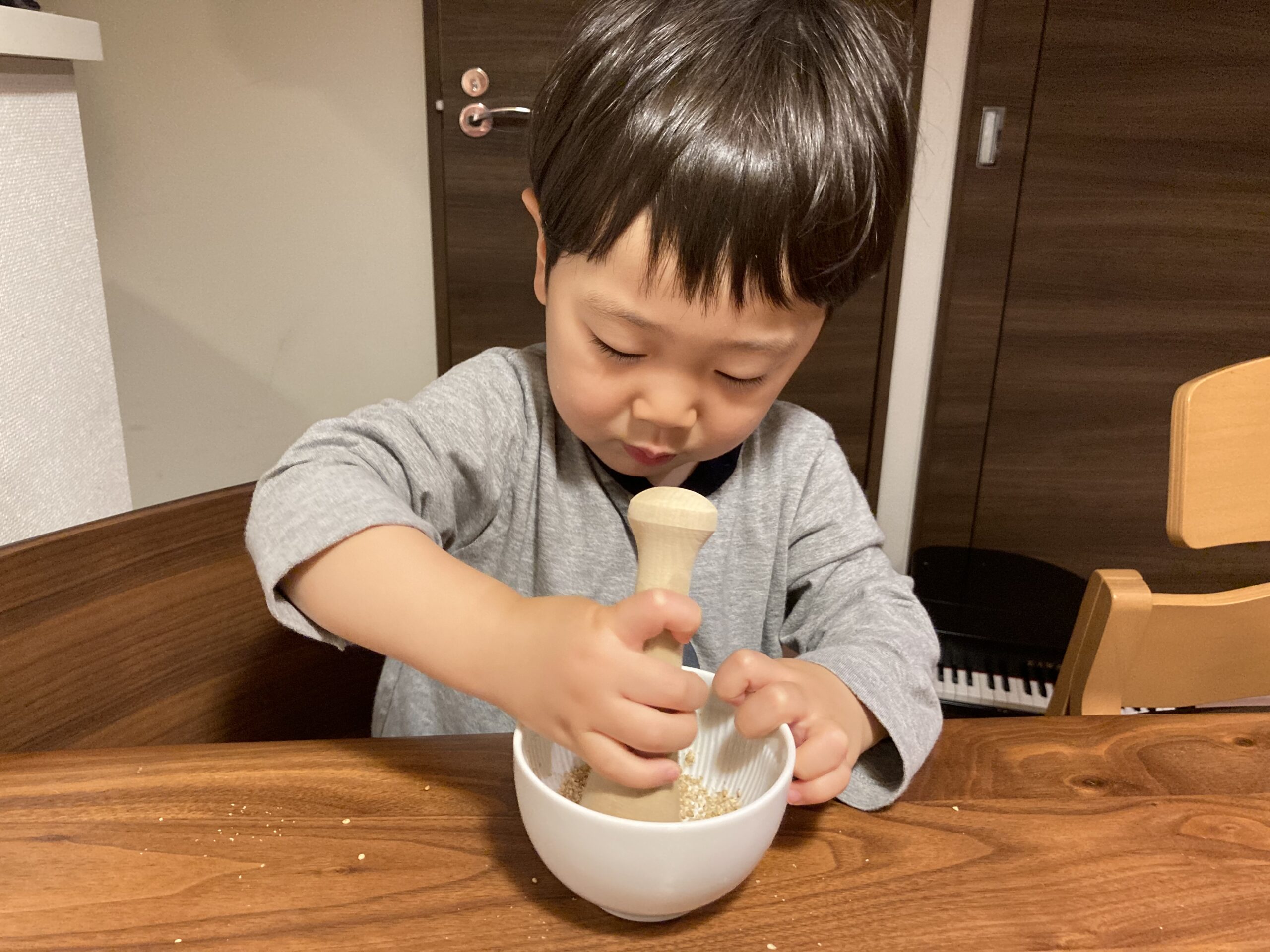 その他、我が家の息子(2歳2か月)はすりたてのごまの香りが気になった様子。「クンクン」と鼻を近づけて匂いを感じていました。