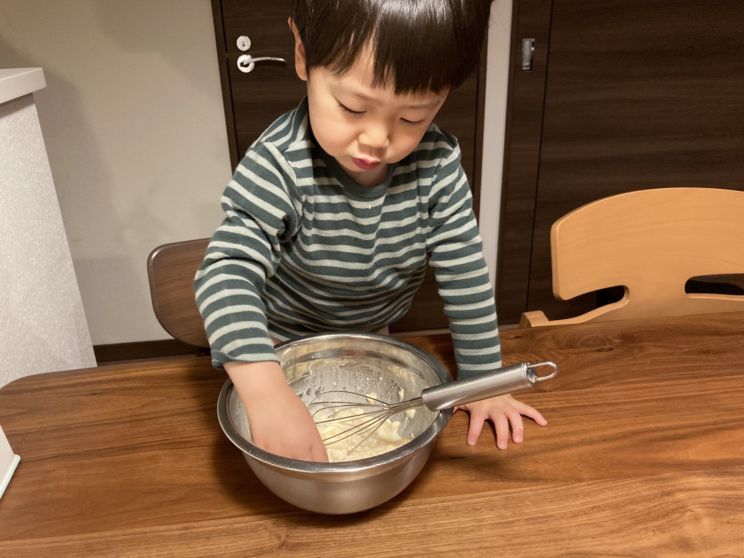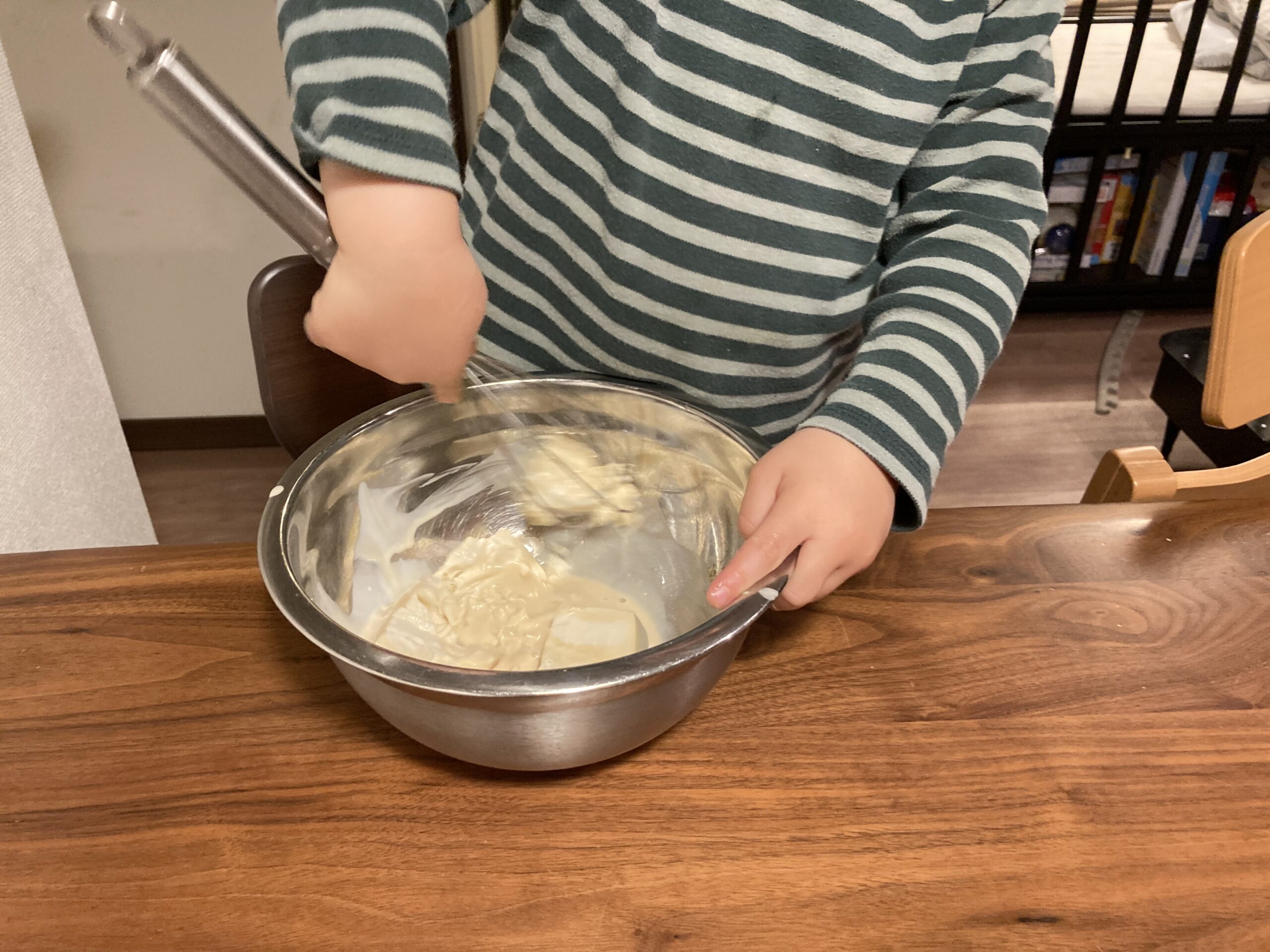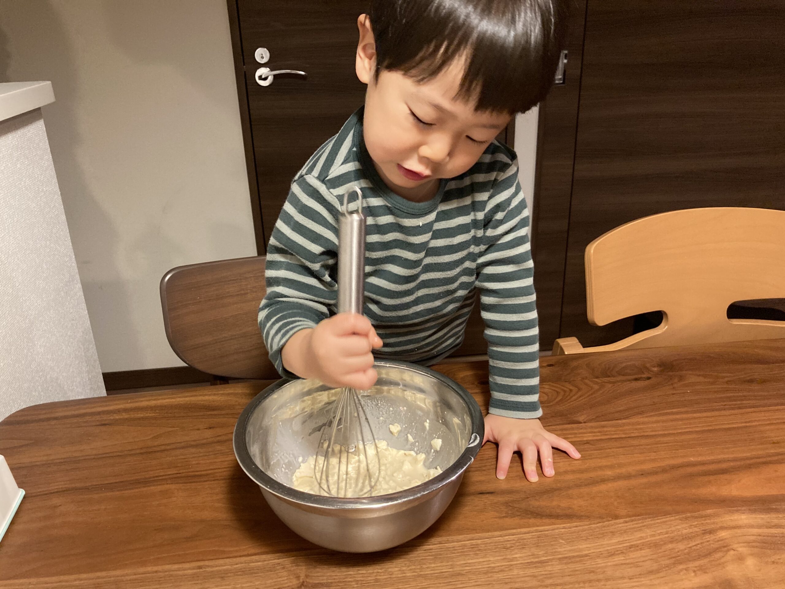 我が家の息子(2歳2か月)はどうしても材料を見ると触りたくなる様子。。混ぜる作業の前にお豆腐をツンツンして感触を楽しんでいました。