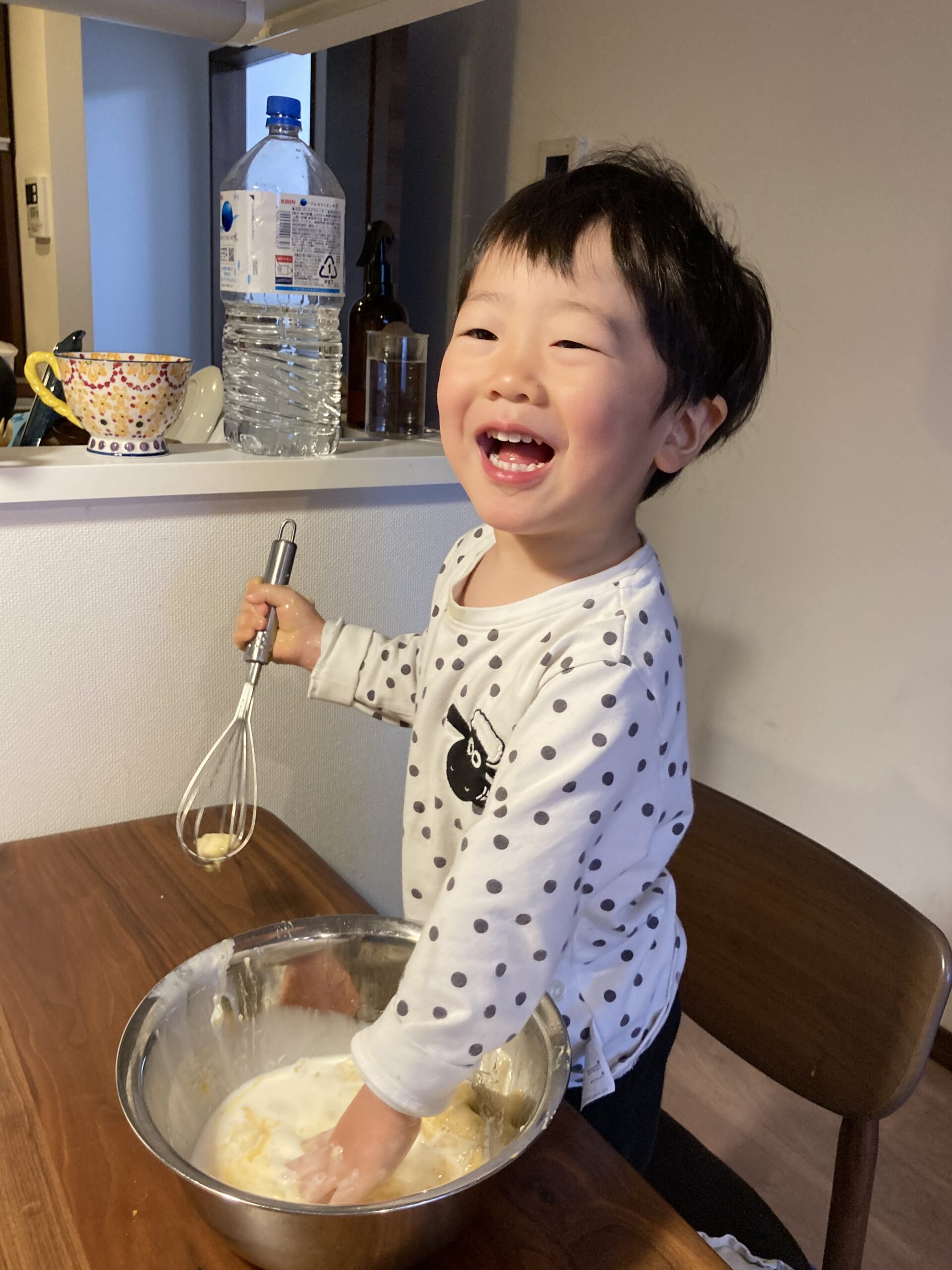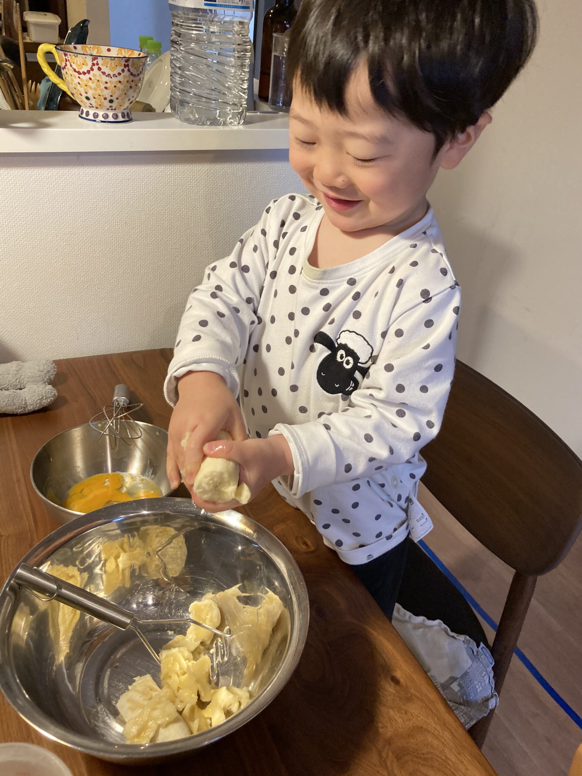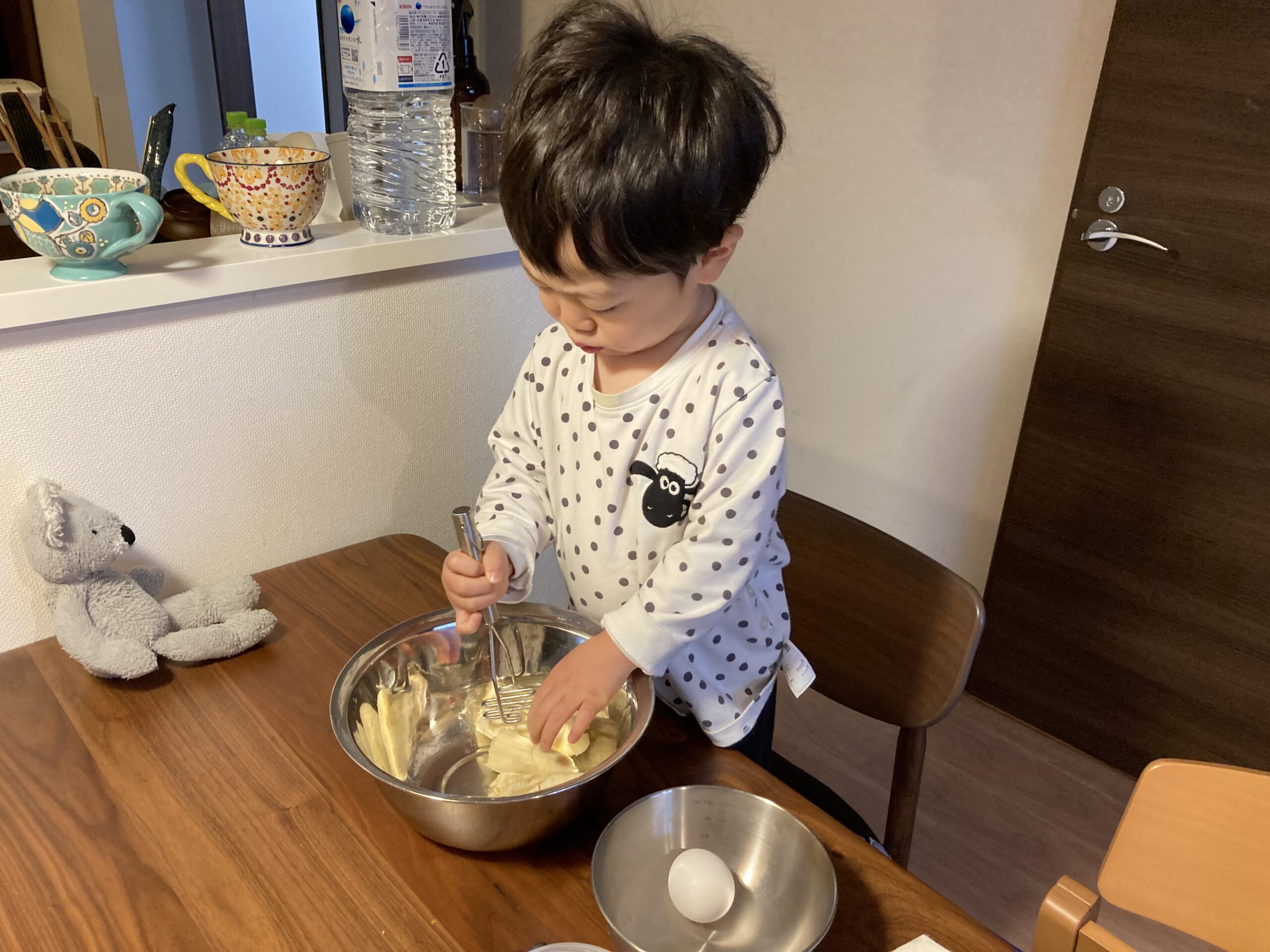 今回、我が家の息子(2歳2か月)はコンコンと打ち付けて、ひびを入れて、白身を出すところまで一人でできました!