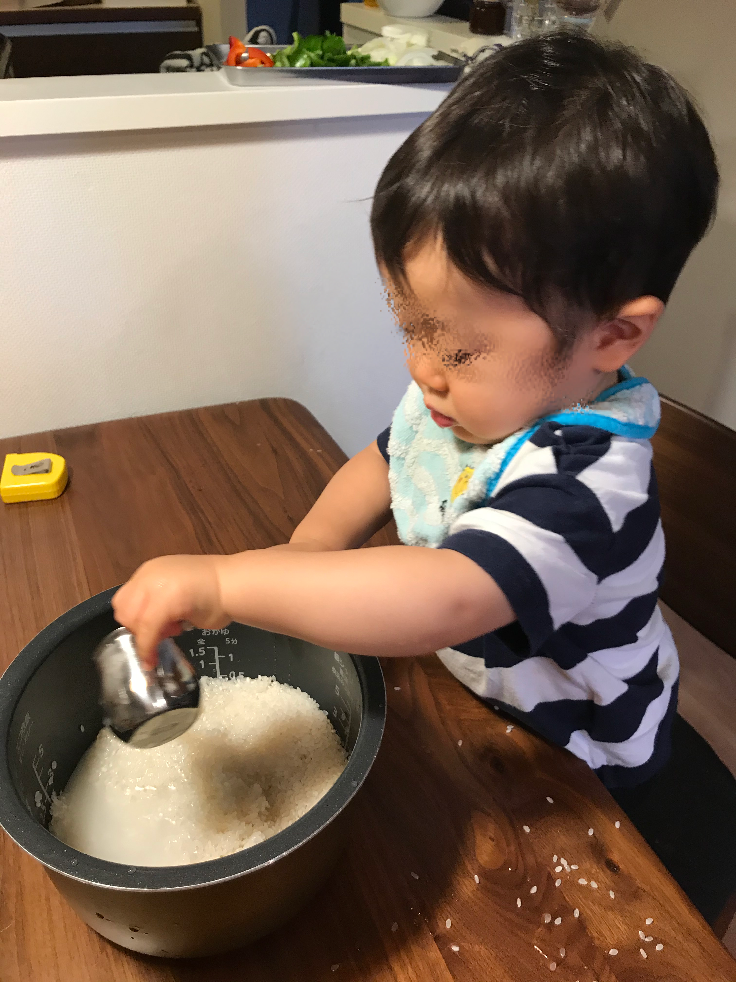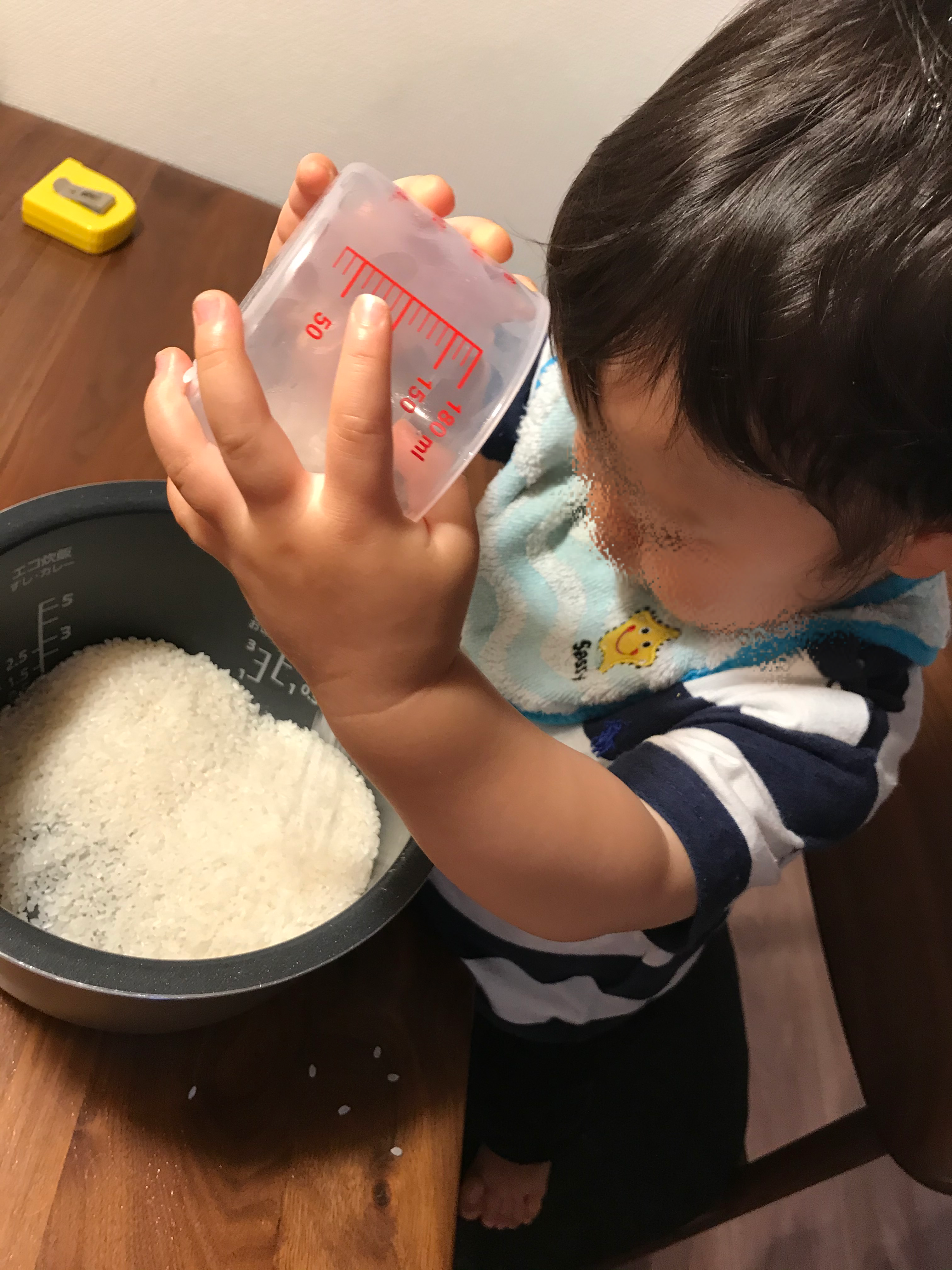 ちいさなこどもと一緒に取り組む場合には、計量はお父さん、お母さんがやり、炊飯器の内釜へ「じゃーっ」とする部分のみこどもにやってもらいましょう。1歳代でも楽しく手伝ってもらうコツは、「少しづつ」、「ゆっくりと」進めることです。