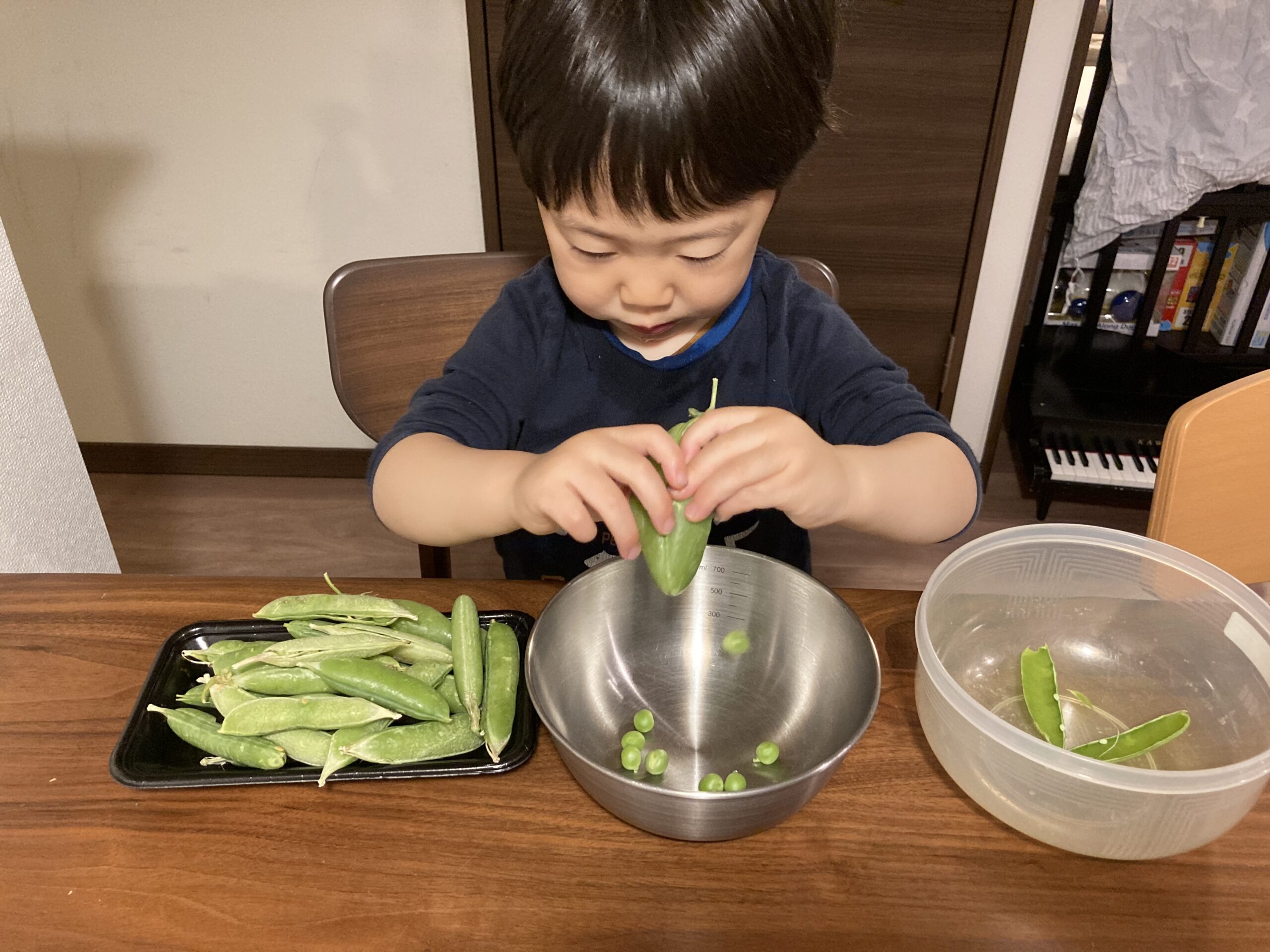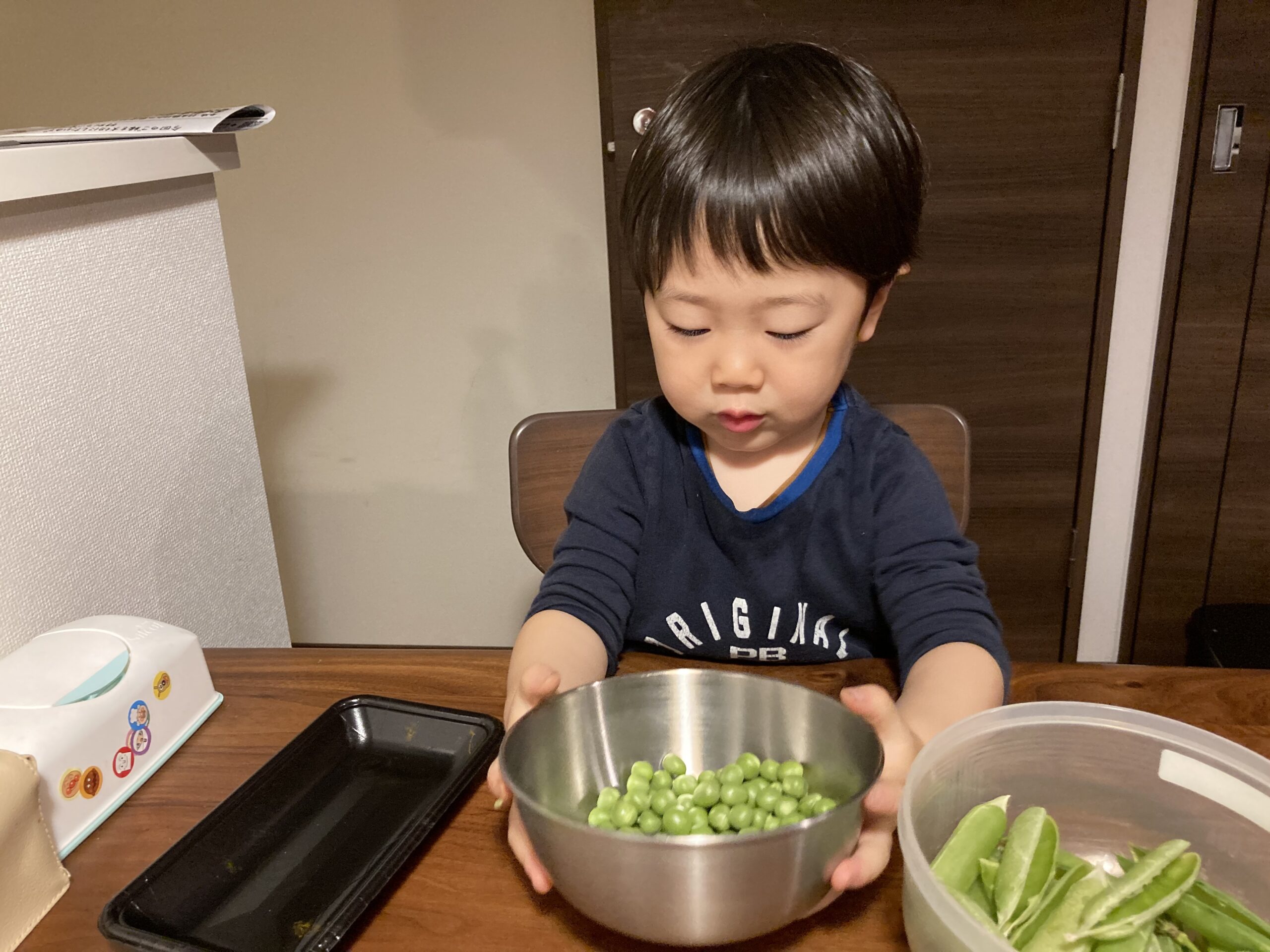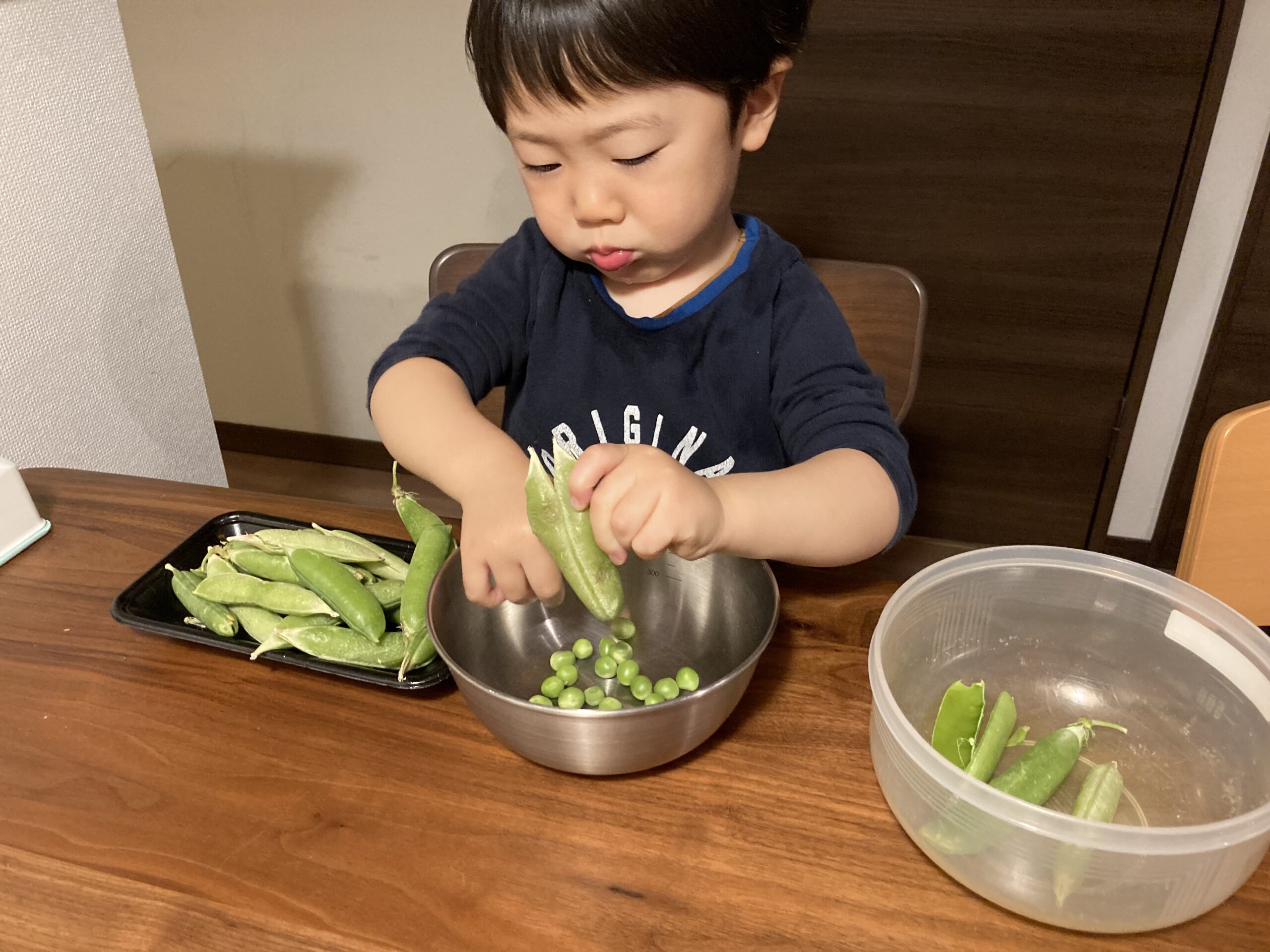 グリーンピースごはん作りの時にも取り組んだグリーンピースの鞘剥き。我が家の息子(2歳2か月)はこの作業にハマっており、無我夢中で取り組みます。