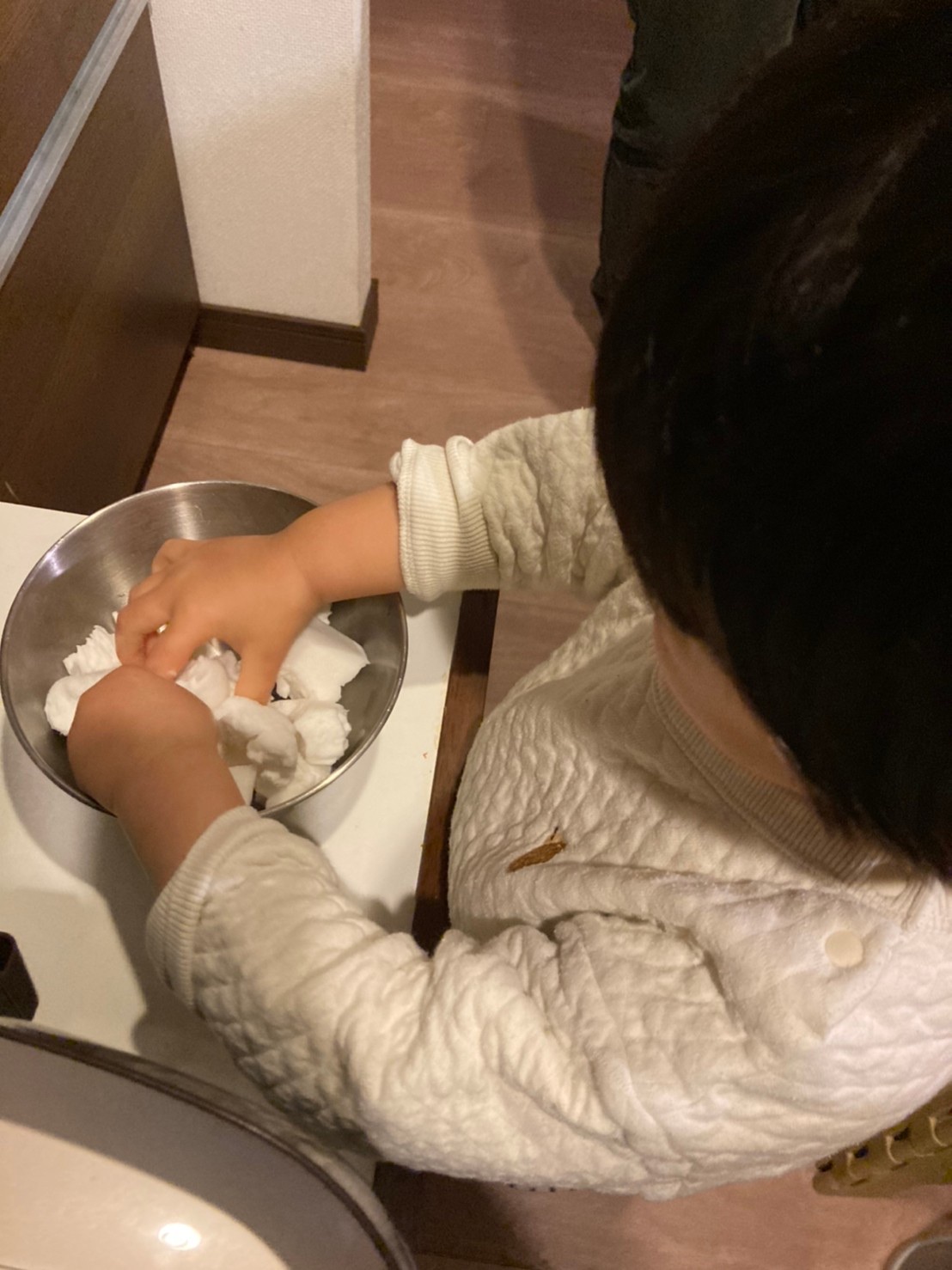 1つははんぺんをちぎるお手伝い。我が家の息子(2歳1か月)はこれまではんぺんを食べることはあっても触る機会はなかったからか、はんぺんちぎりをお願いした時には不思議そうにその感触を楽しんでいました。