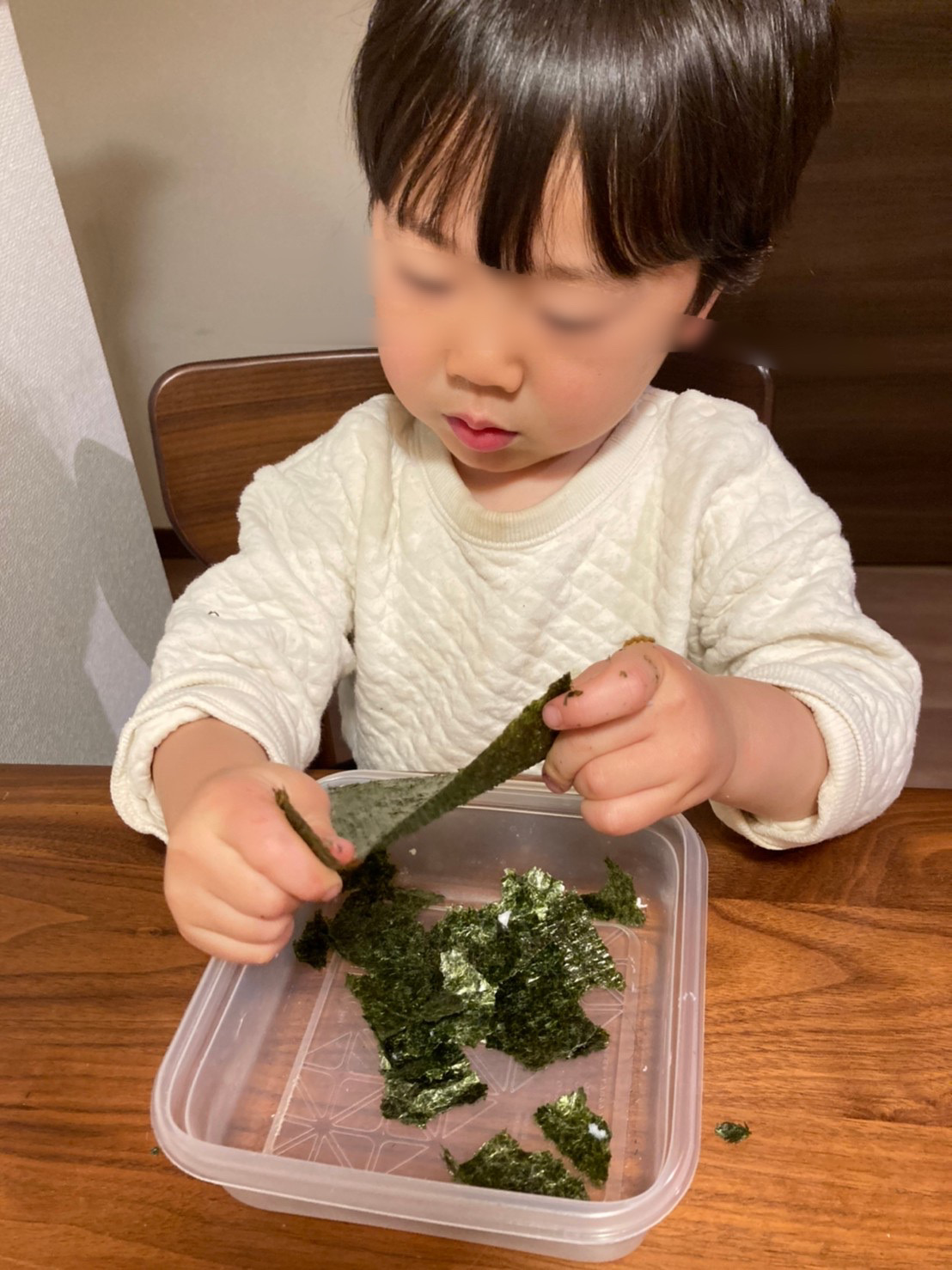 ちぎる行為は両手を上手に動かして、指先で力を加減しないとなかなか上手くできない意外と高度な動きです。我が家の息子(2歳1か月)ははんぺんちぎりは大好きだったものの、のりちぎりは引っ張ってもなかなか上手くいかずにあまり興味を示さずでした。