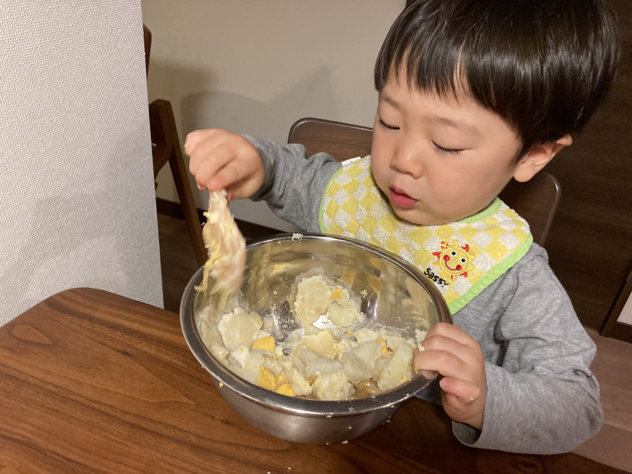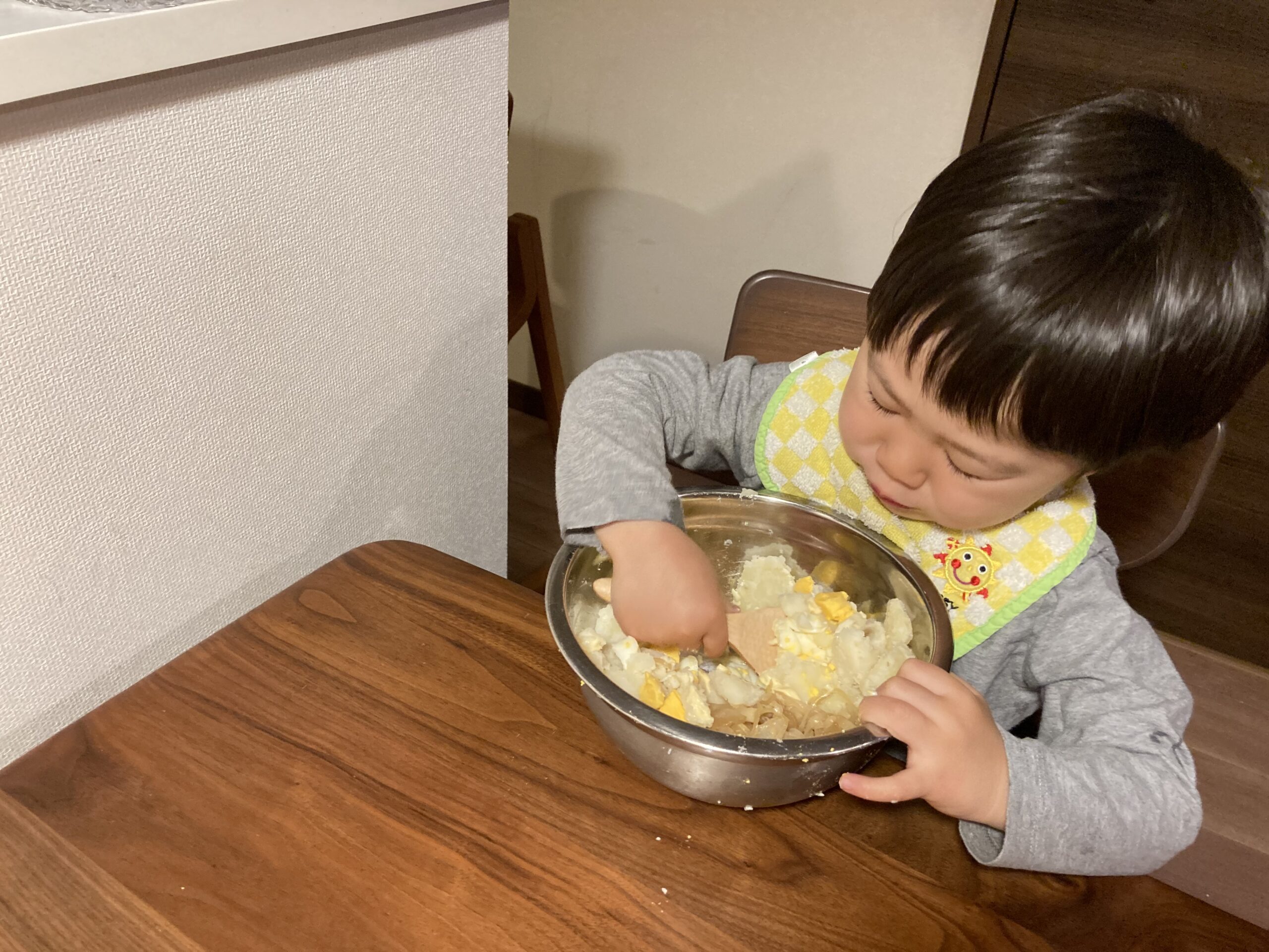 今回はポテトサラダを混ぜて仕上げるお手伝いもお願いしました。