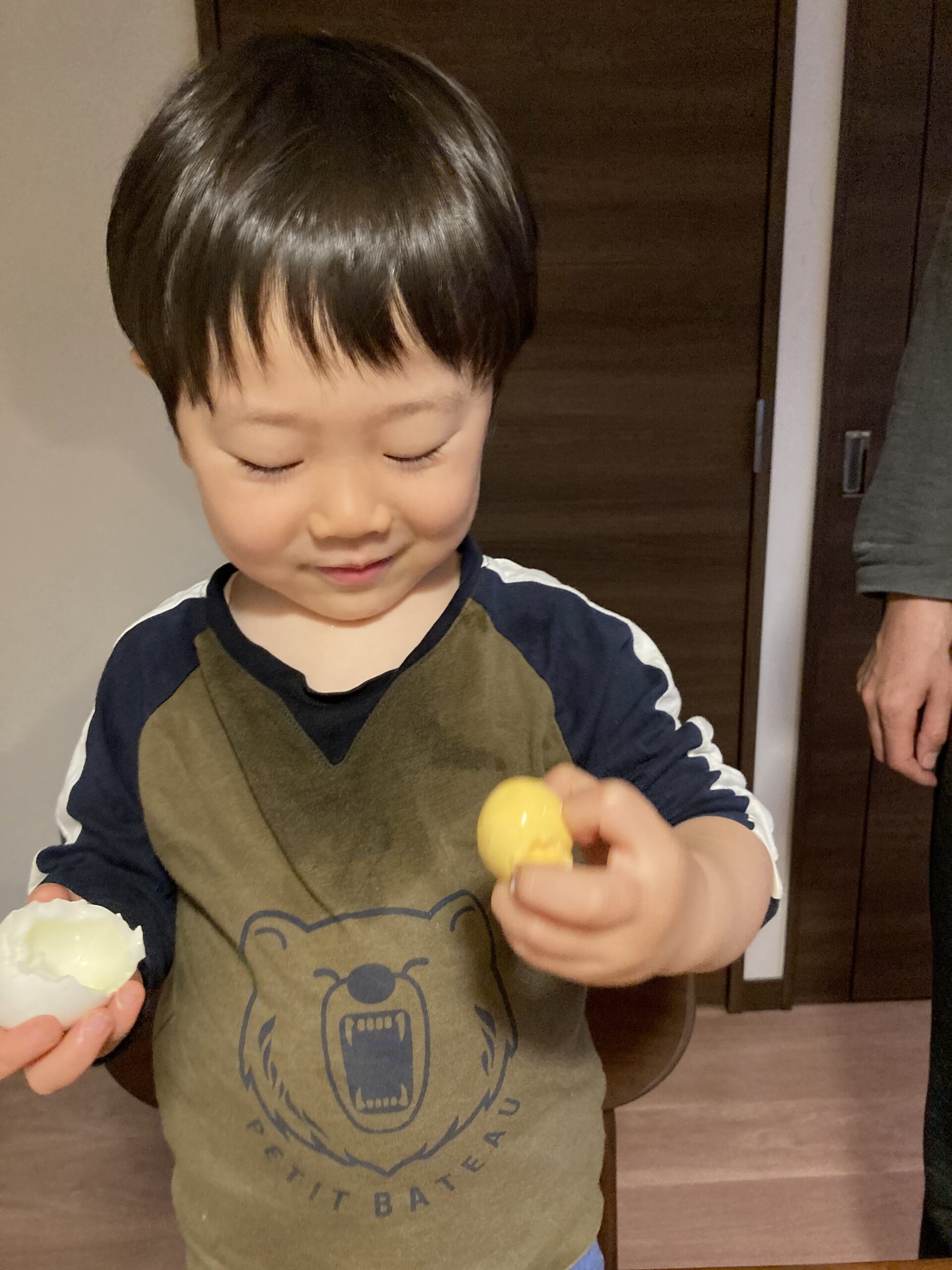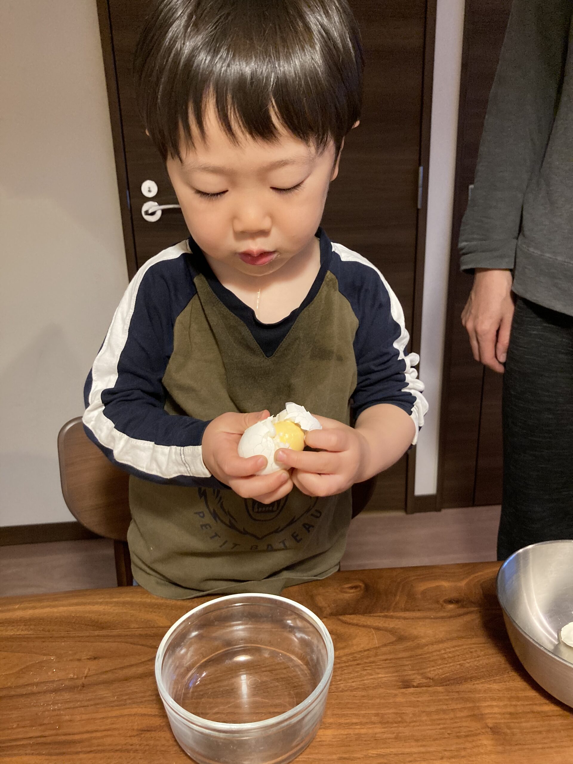 卵を持つと、手慣れた様子でコンコンと打ち付ける息子(2歳2か月)。今回は何度もコンコンコンコン。