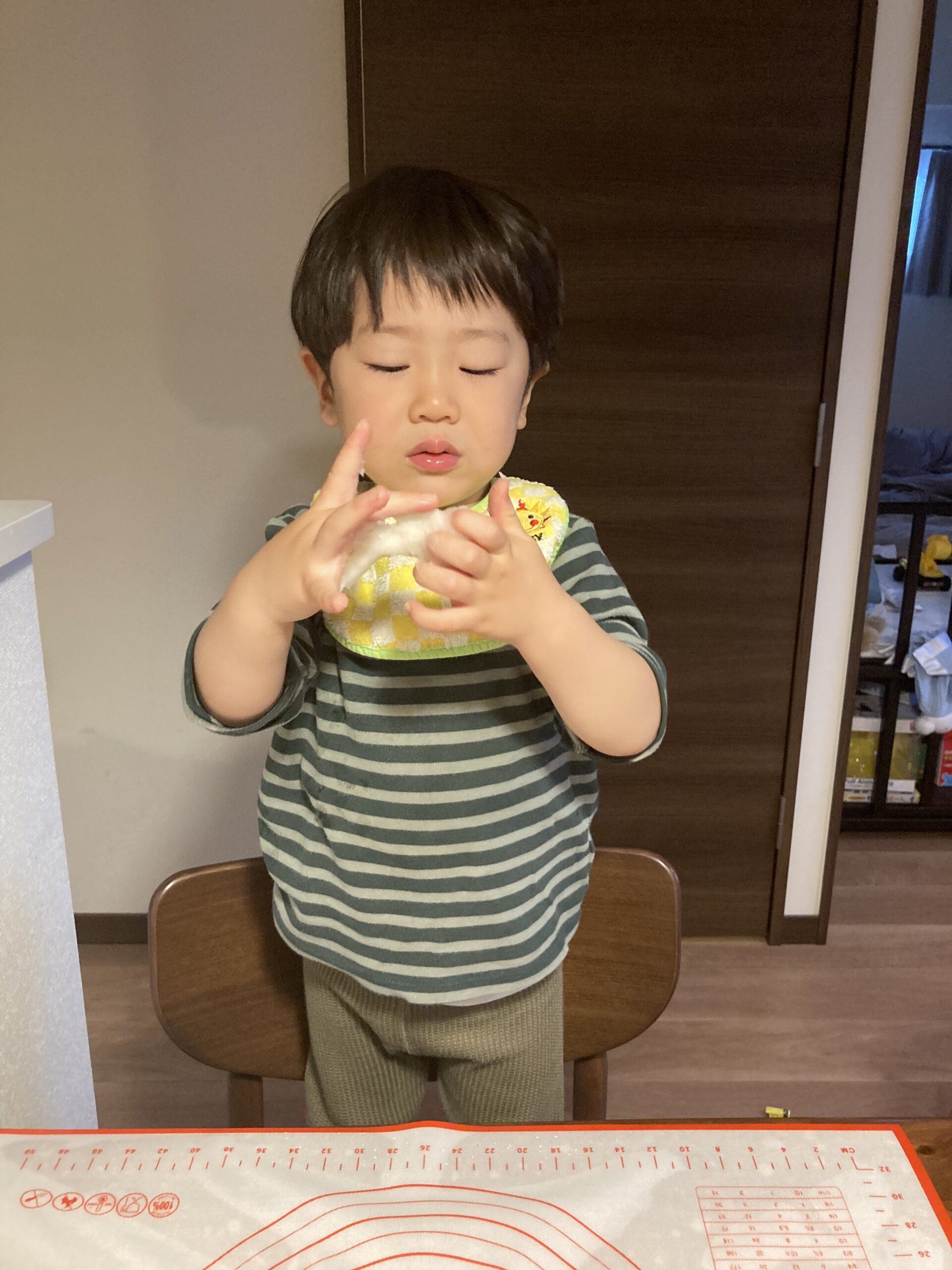 こねる作業、いつも楽しそうになっているので、今回もきっとヒットするはずと思ったのですが、べとべとは苦手だったようです。