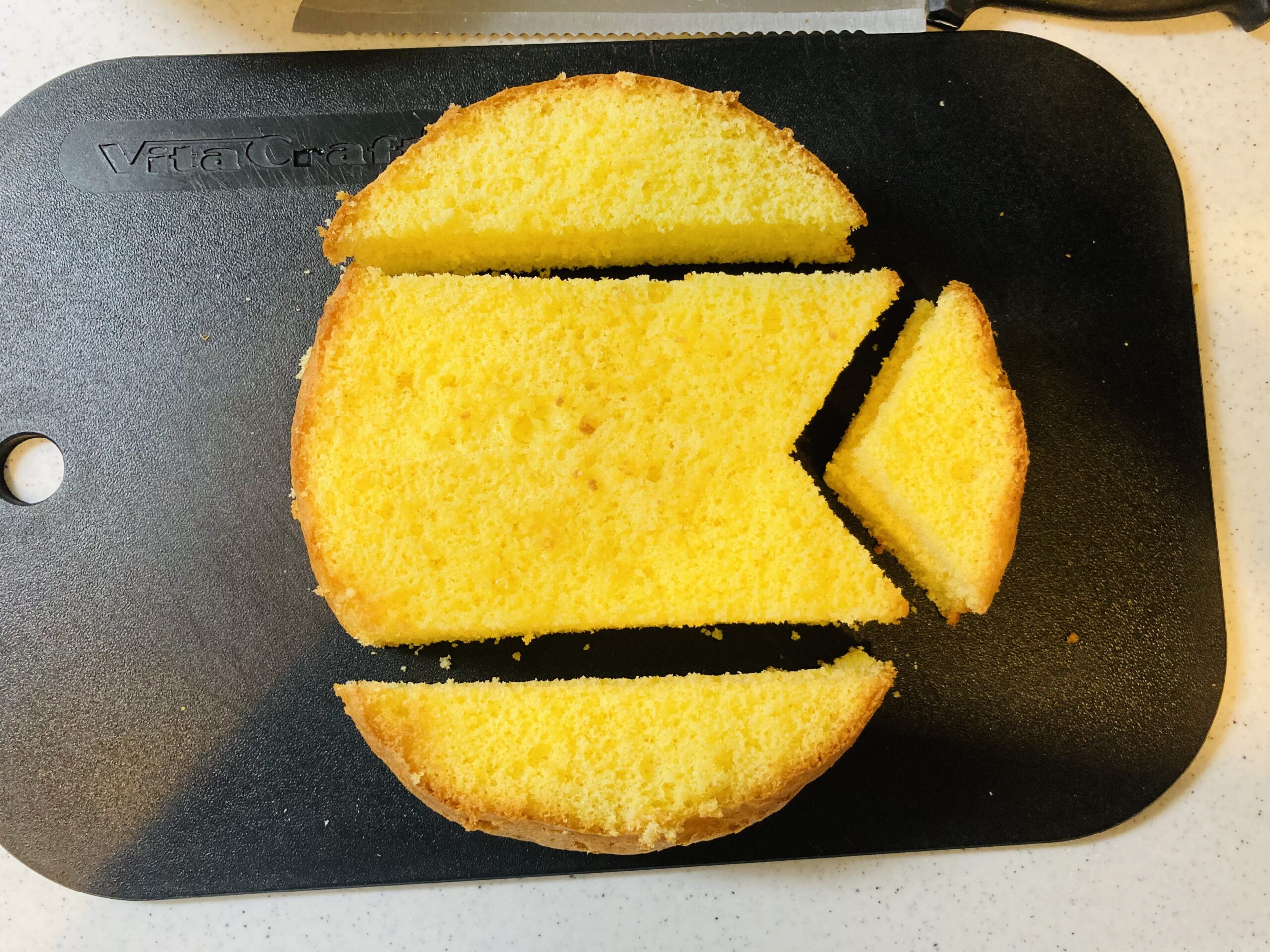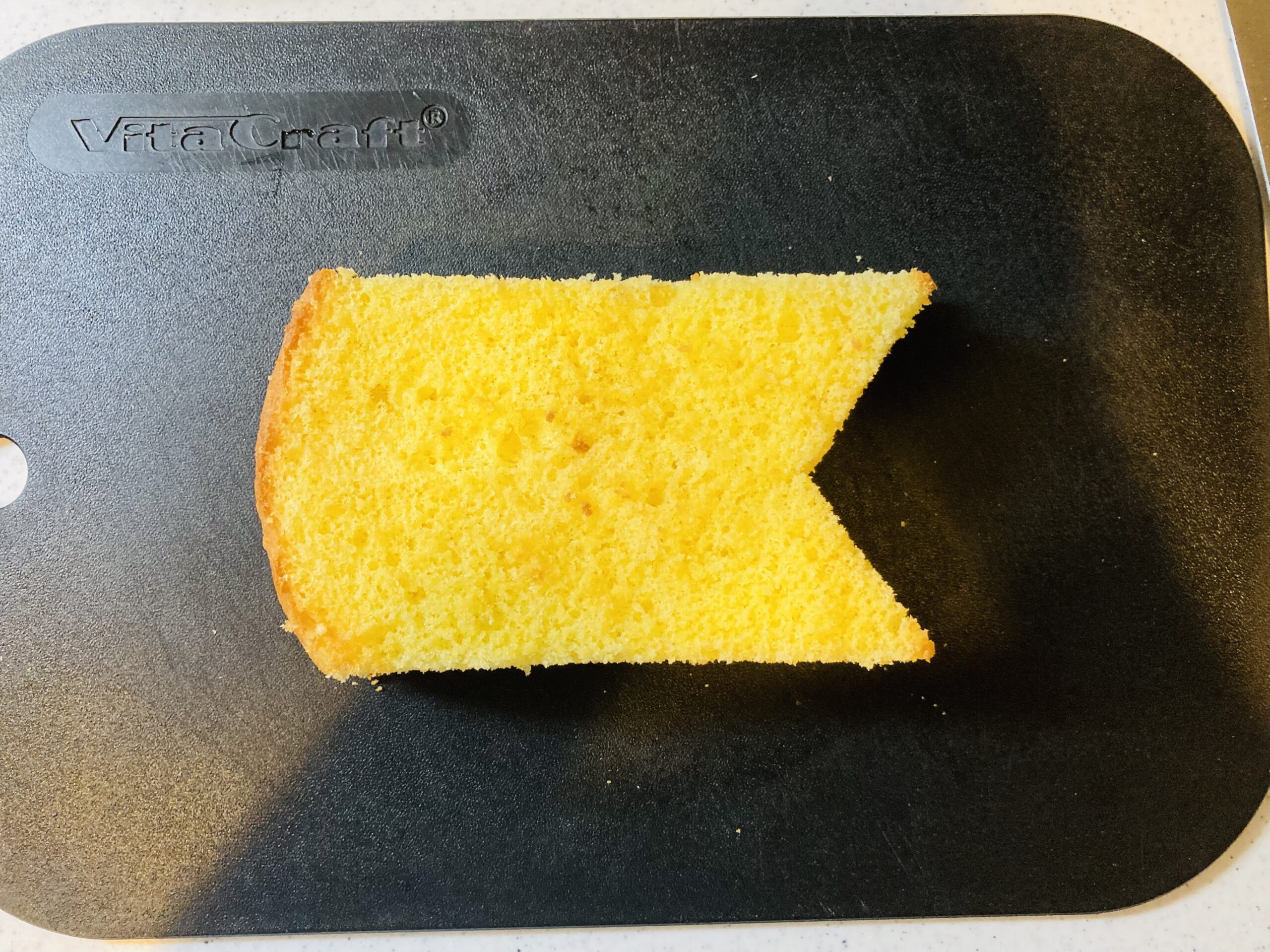 ③スポンジは底から2㎝の厚さで2枚にカットして、端の部分を直線にカットします。尾を作るように、片側だけV字型にカットします。