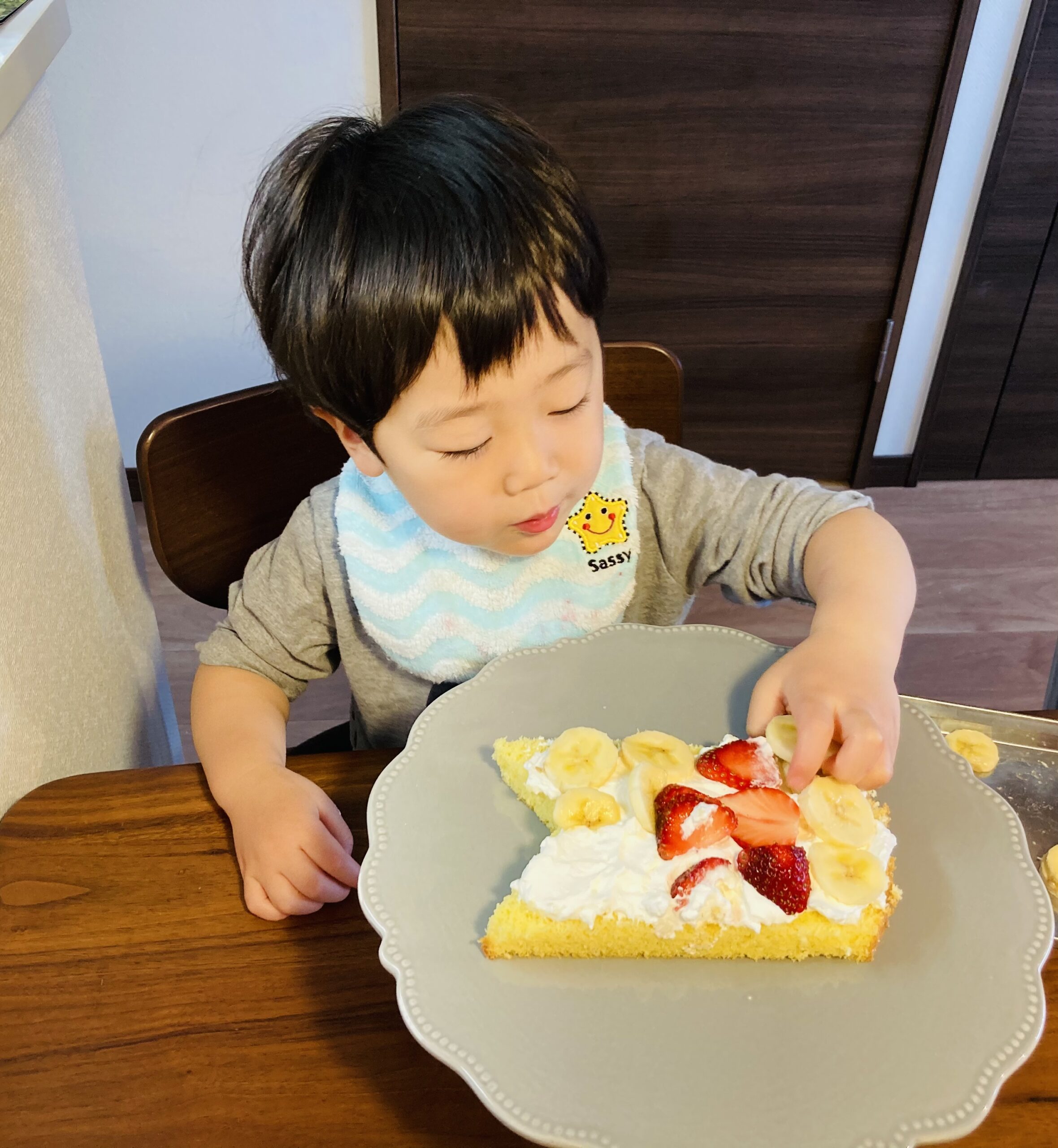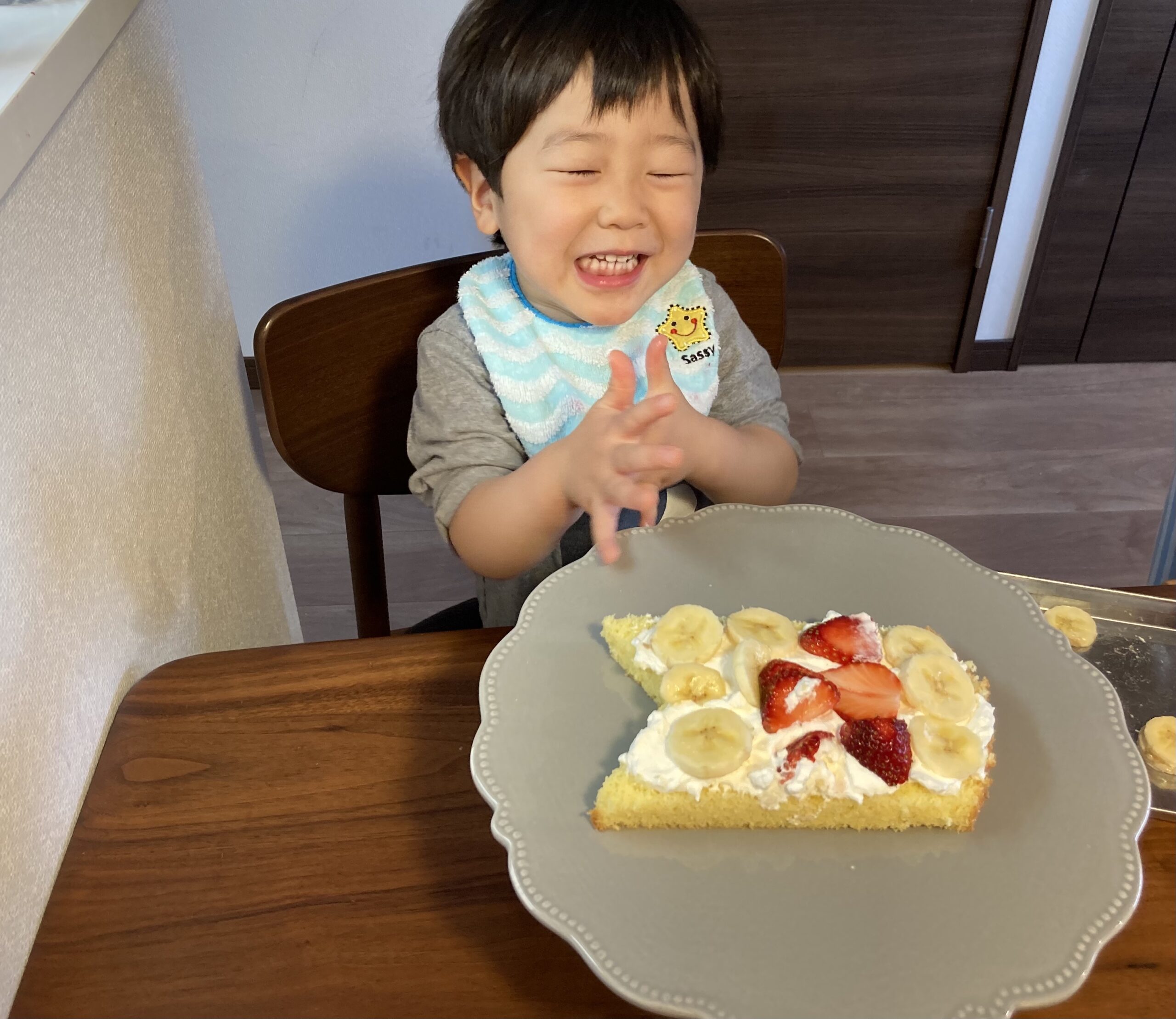 このケーキを作っている間、ケーキが食べられることへの期待が膨らんでいたのか、ノリノリでお手伝いしてくれた息子、ケーキが完成すると、満面の笑みを見せてくれました。こういう顔を見ることができるととても嬉しい♪