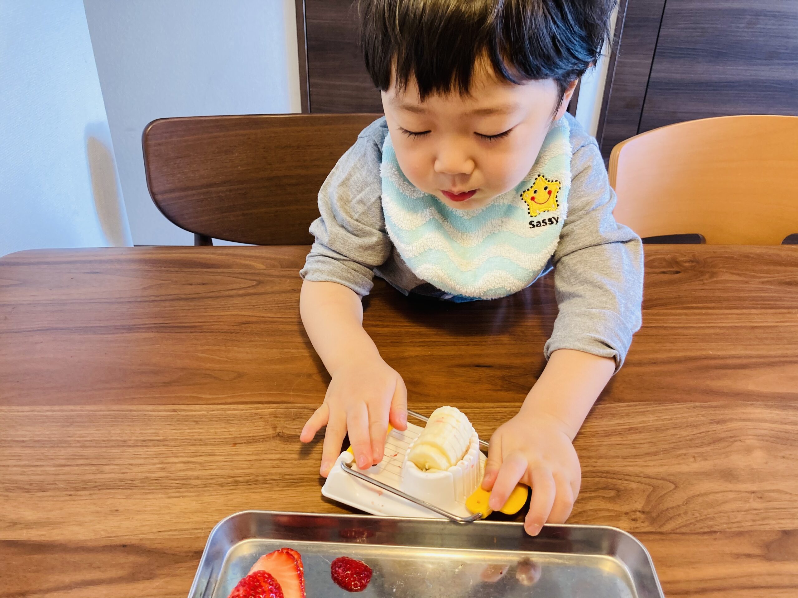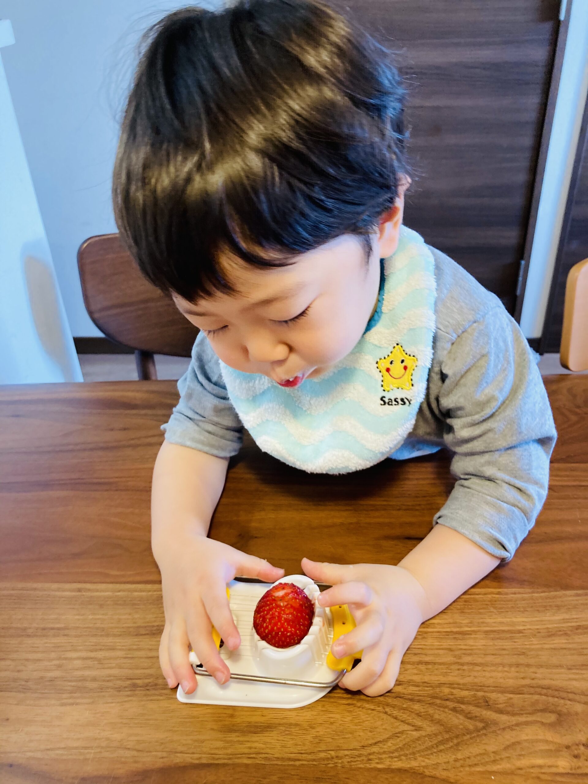 今回、我が家の息子はイチゴとバナナをスライサーでカットしました。大人が包丁で切るよりも、均一に薄くスライスできてケーキの飾り付け用にピッタリでした。