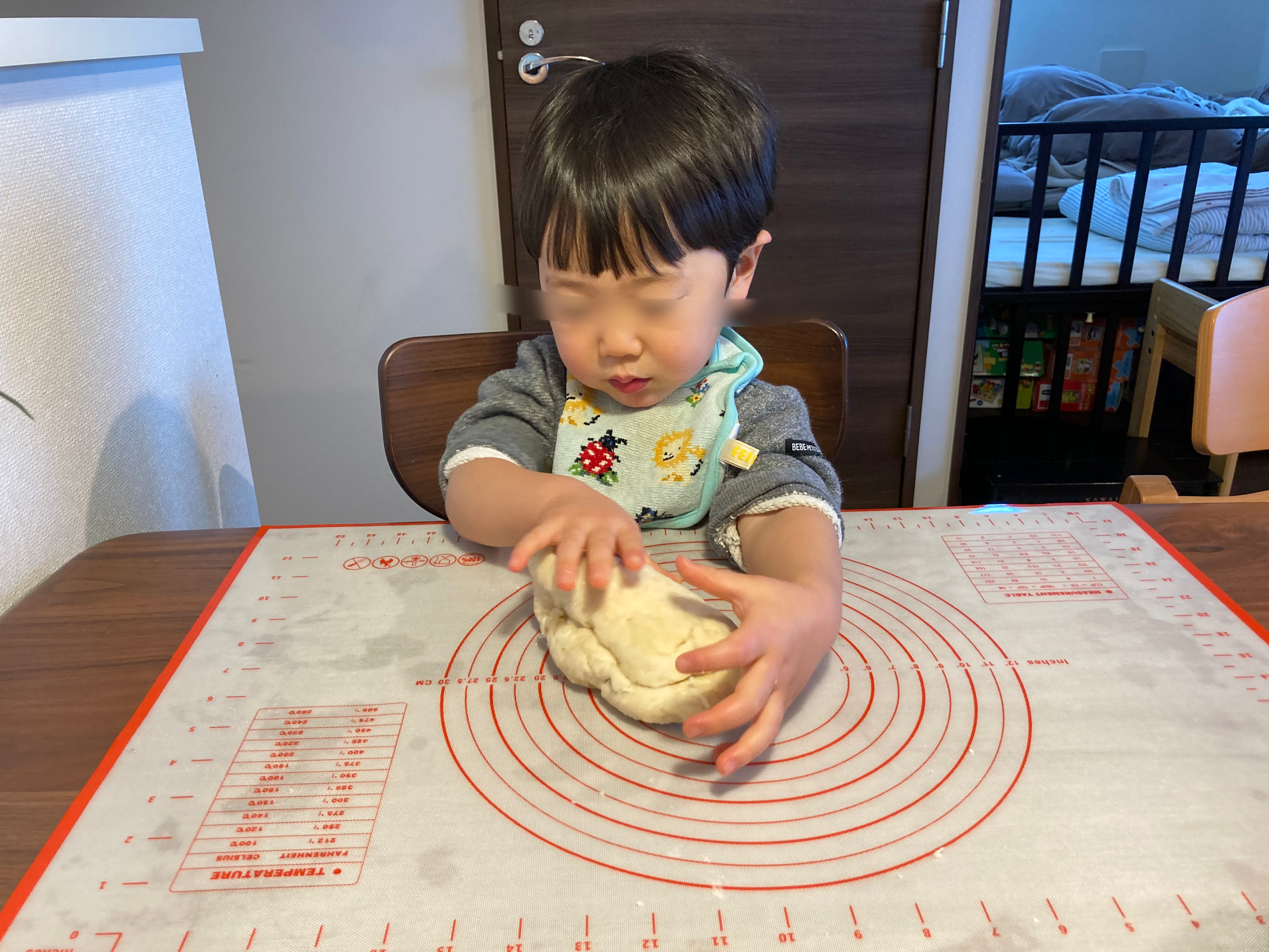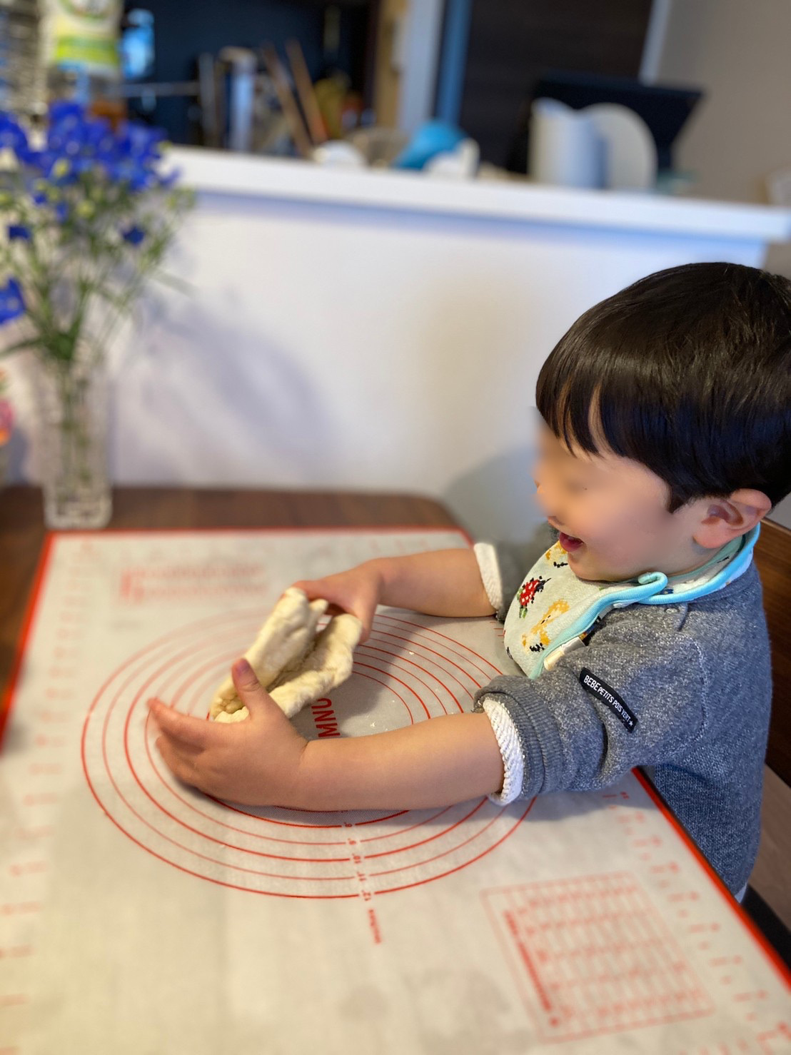 生地をこねる作業は手をたくさん動かすので指の発達を促す他、五感に働きかけることにもつながりますね。