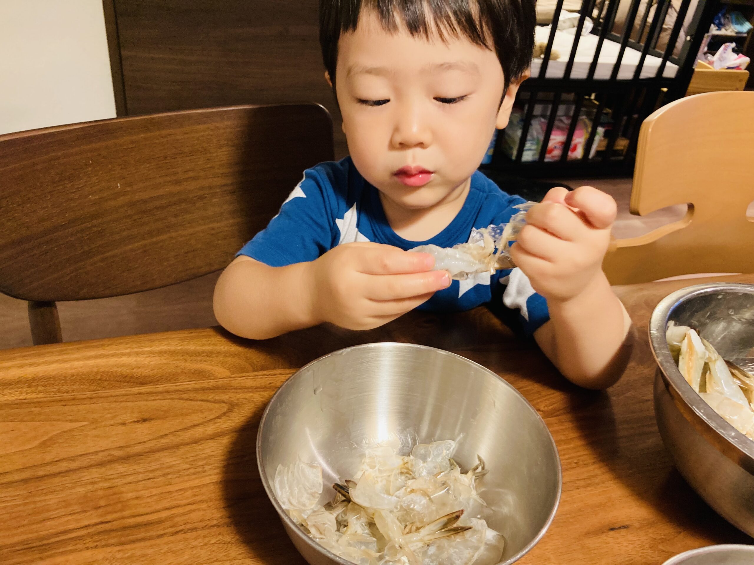 水族館で小さなエビを見た以外は、初めて殻のついたエビを見た我が家の息子。生きているエビと勘違いしたのか、「おーいえびさーん」と一生懸命話しかけていました。