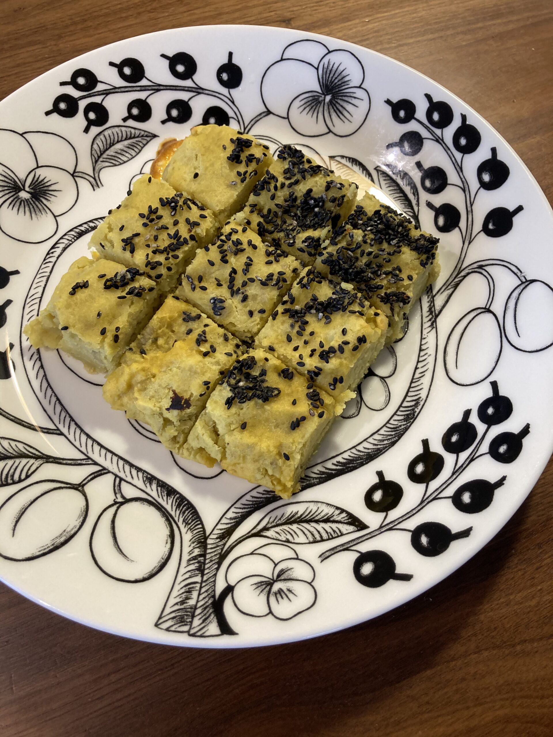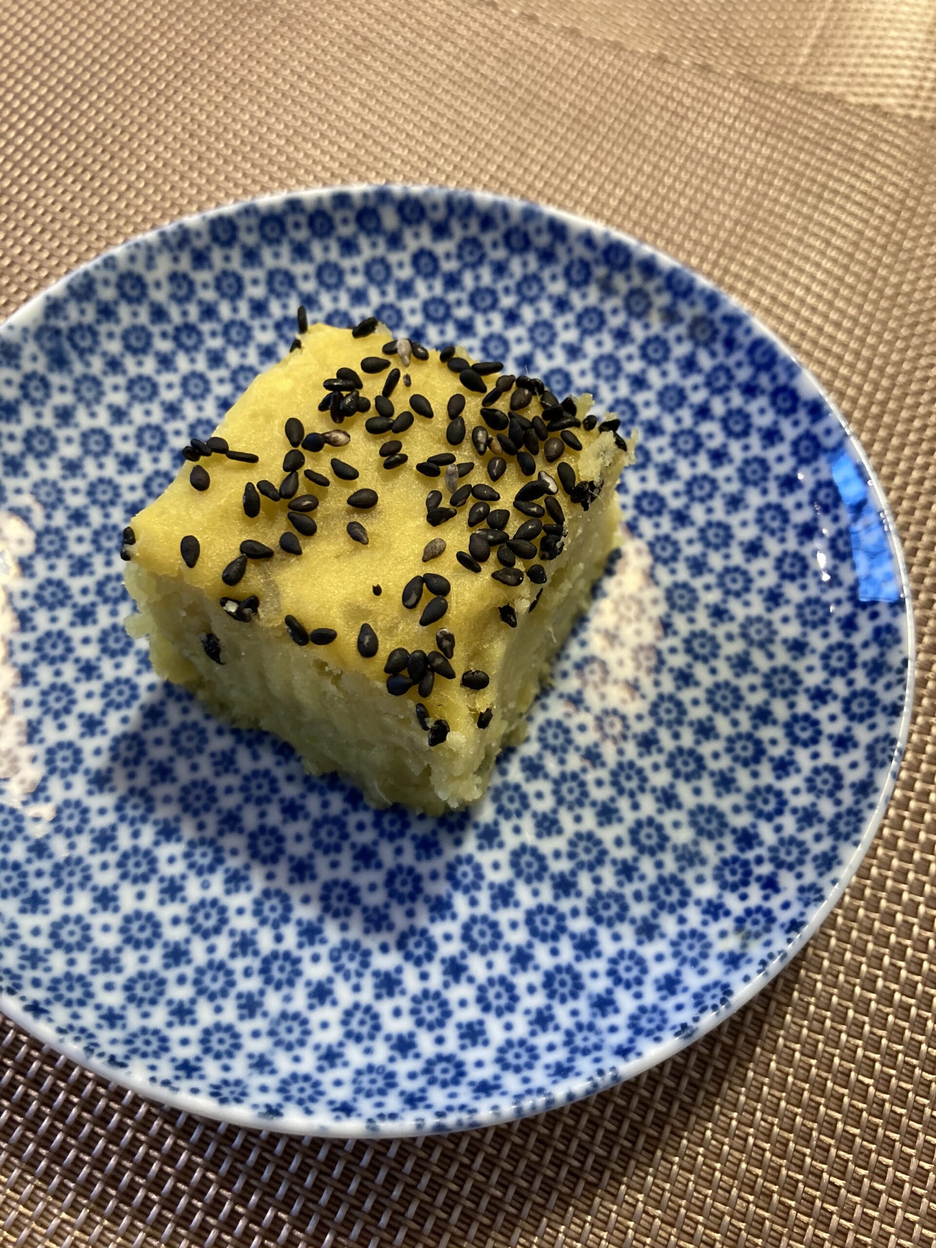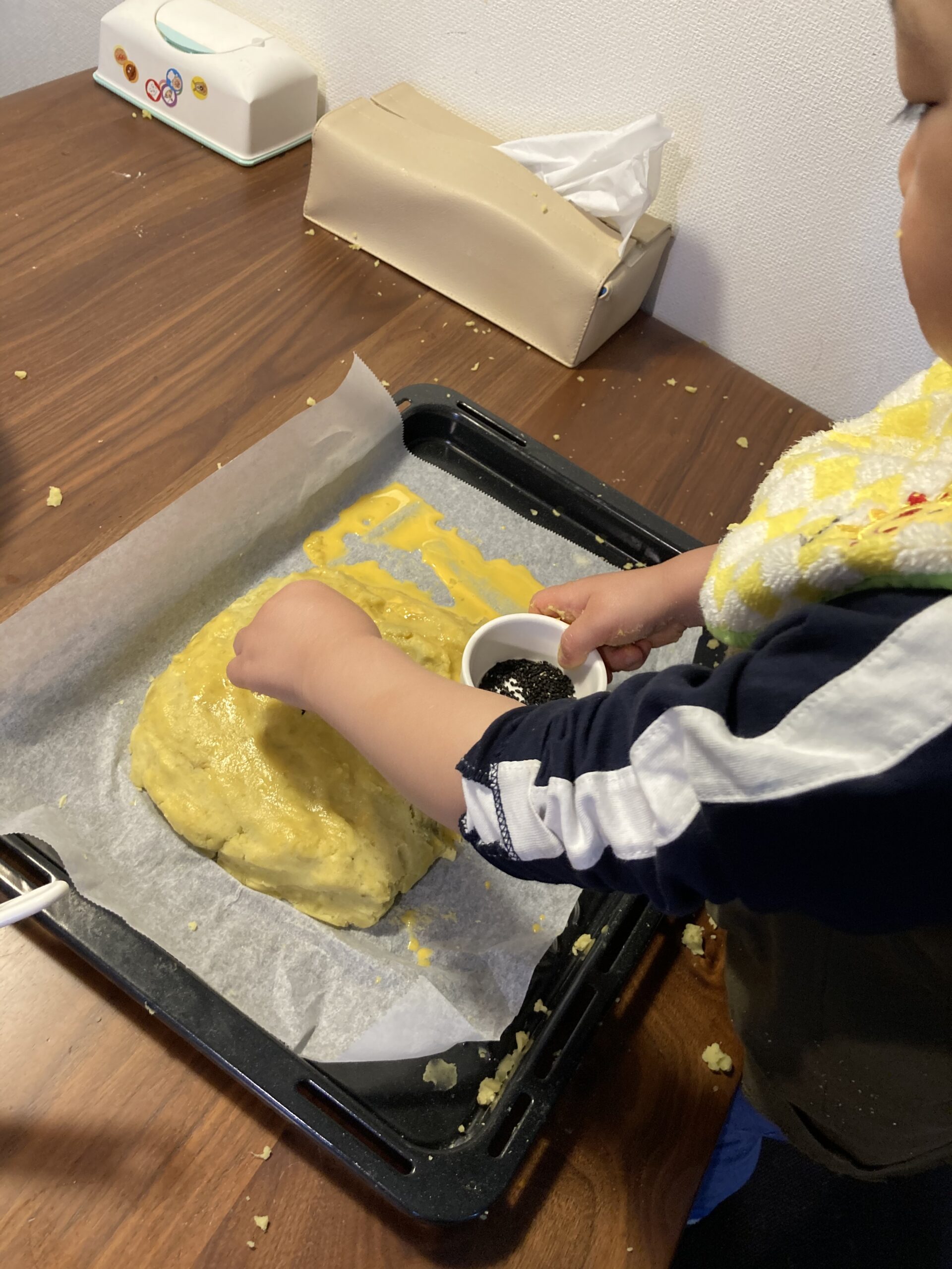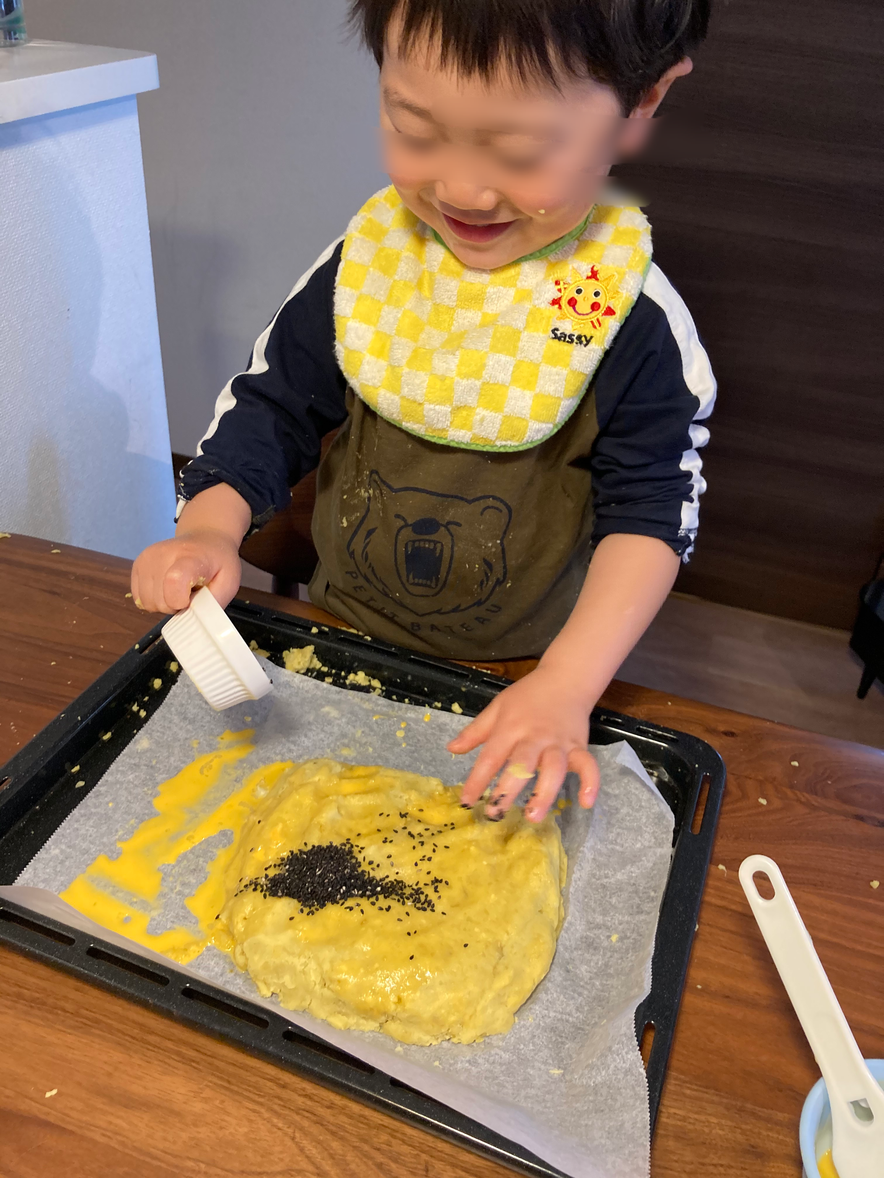 結局、ドラミンが作ってもひたすら壊されてしまったので、今回は丸い形を諦めて「お山を作ろうねー」全てのさつまいもを集めて大きな四角のスイートポテトにしました。お子さんに応じて、作りやすい形で作ってみてくださいね。