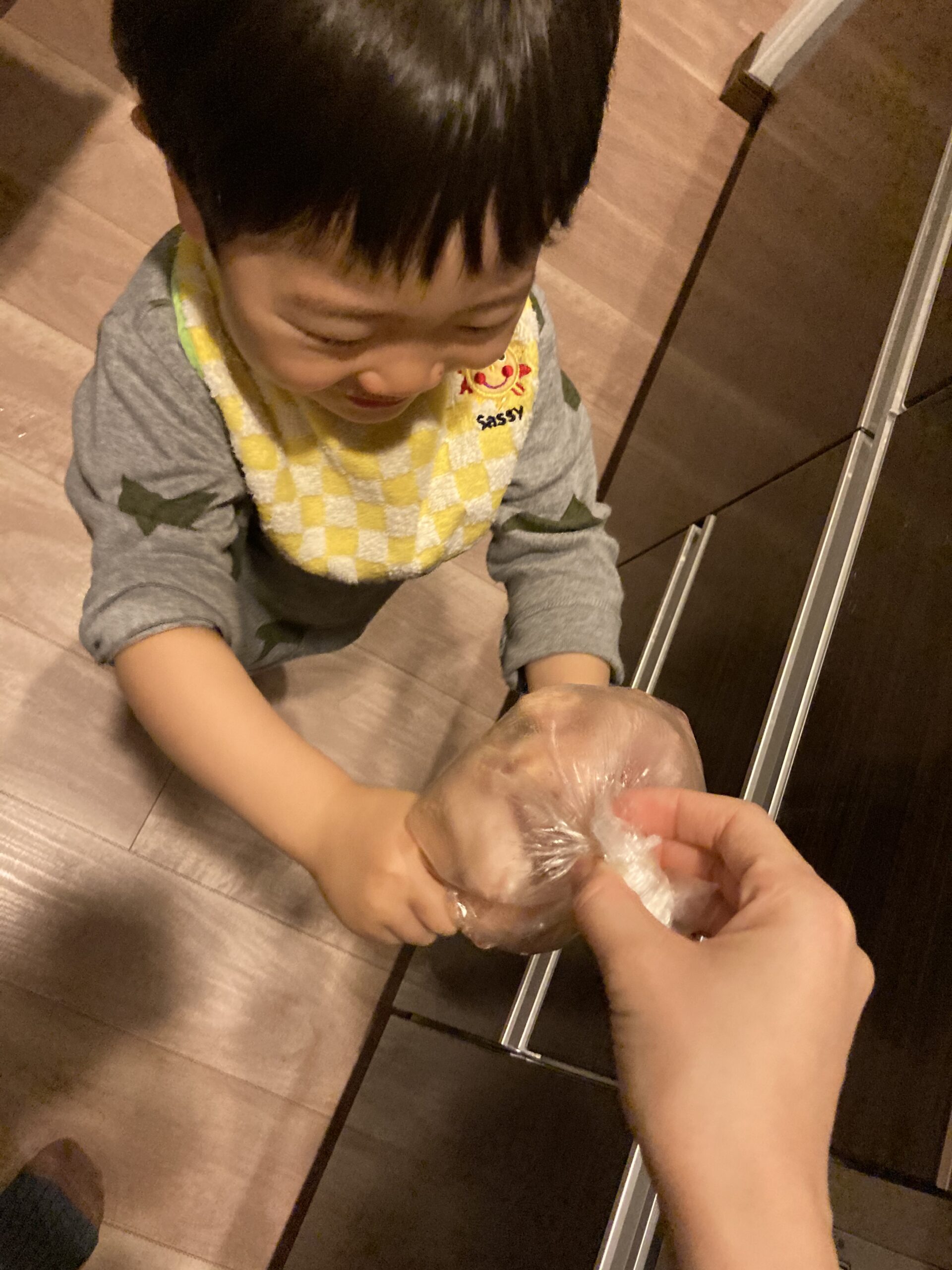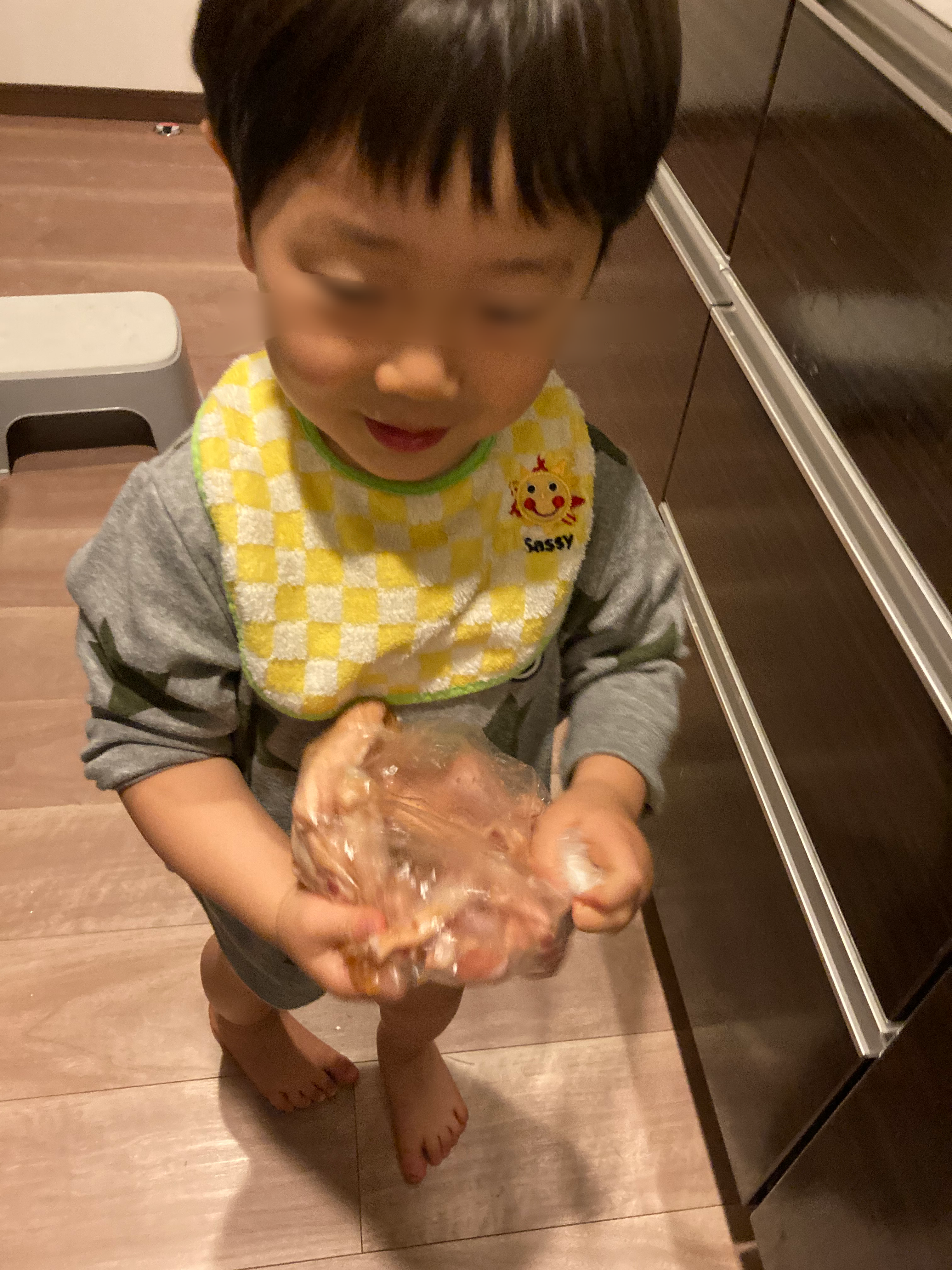 今回は袋の上からお肉に調味料をもみ込むお手伝いをお願いすることができます。生のお肉を触るわけではないので、1歳くらいの小さなお子さんからチャレンジできると思います。