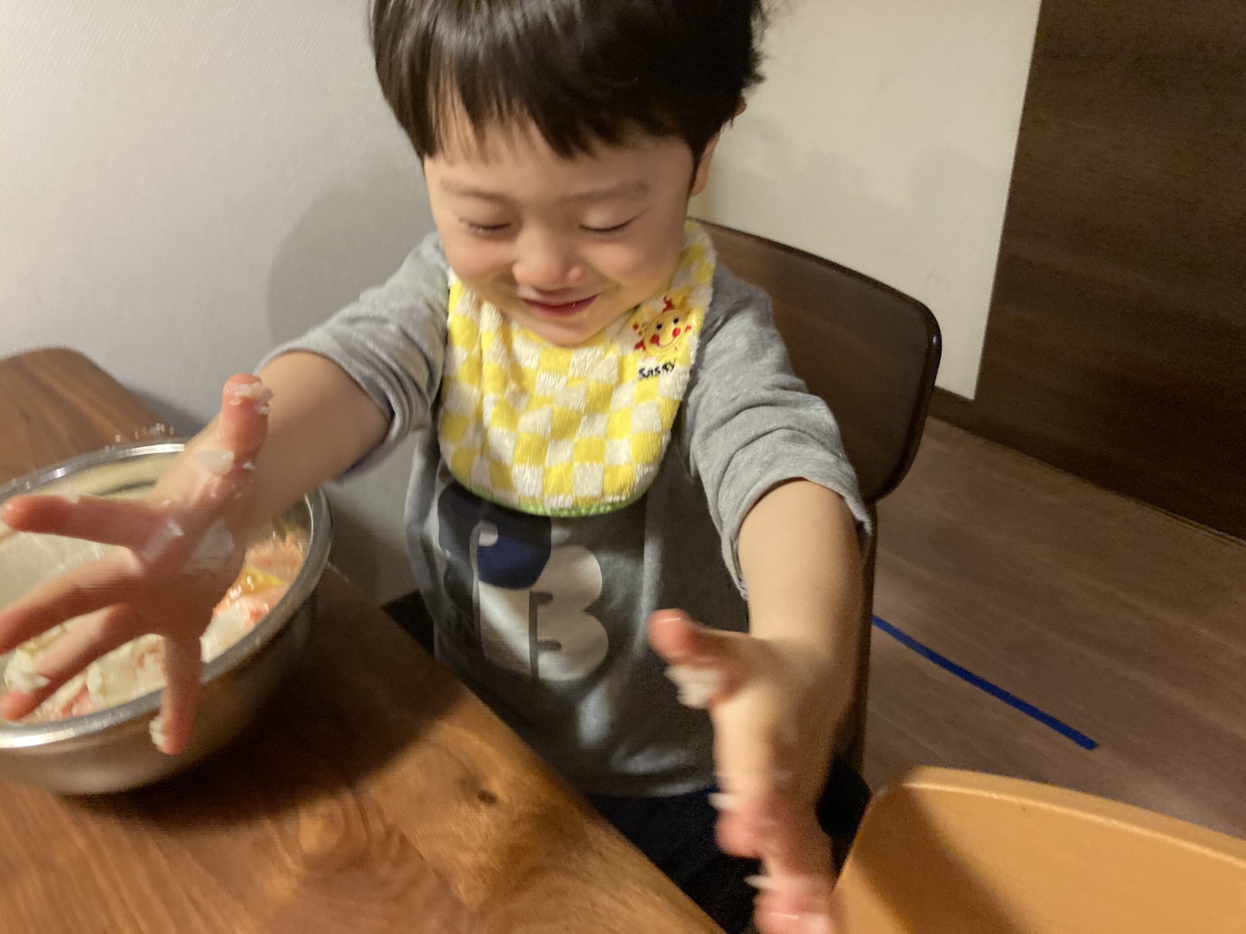 材料に含まれる卵を割るのをお手伝いしてもらうこともできますね(「卵を割る」の詳細は★クッキー作り★の回をご参照ください)。