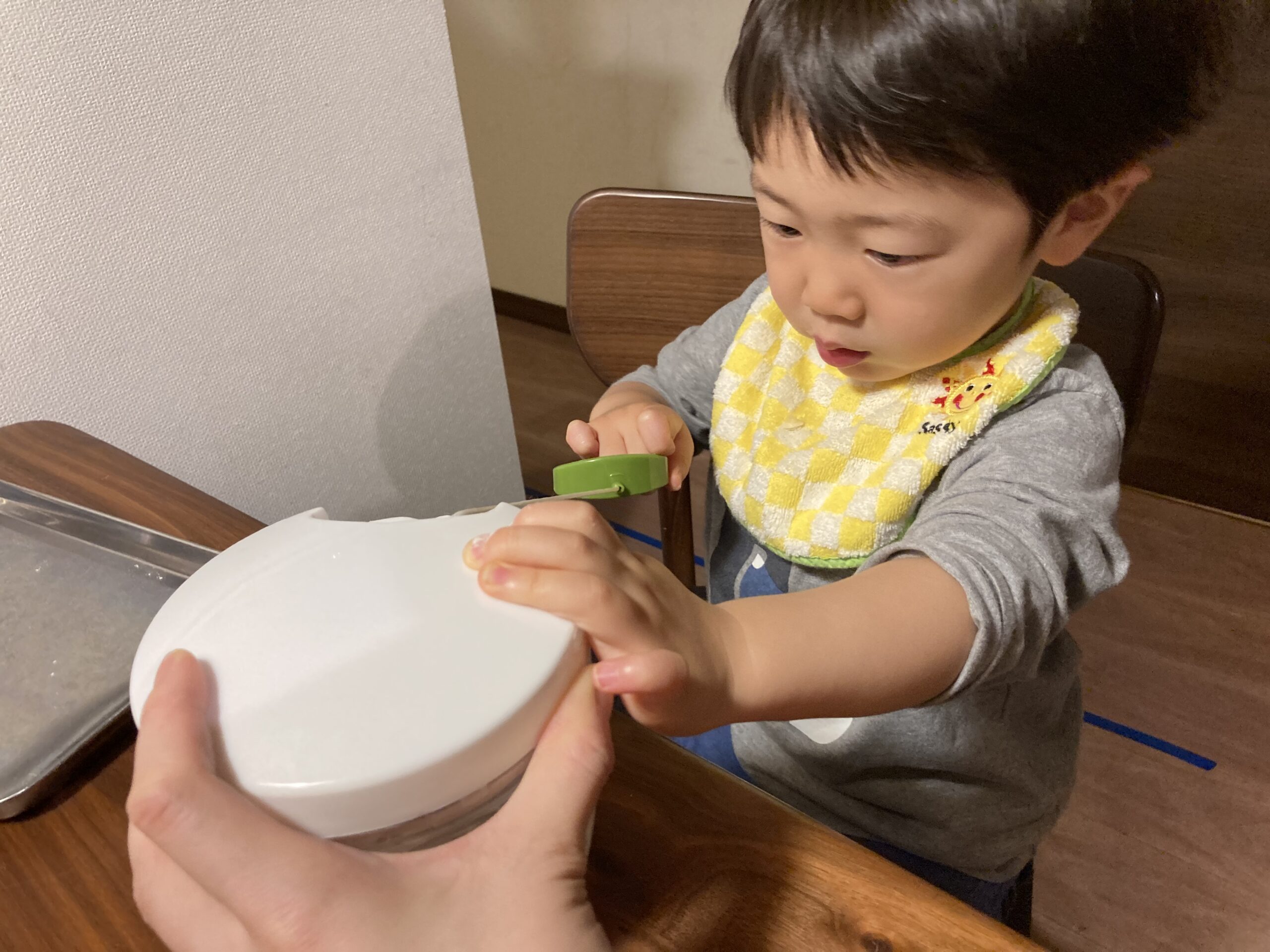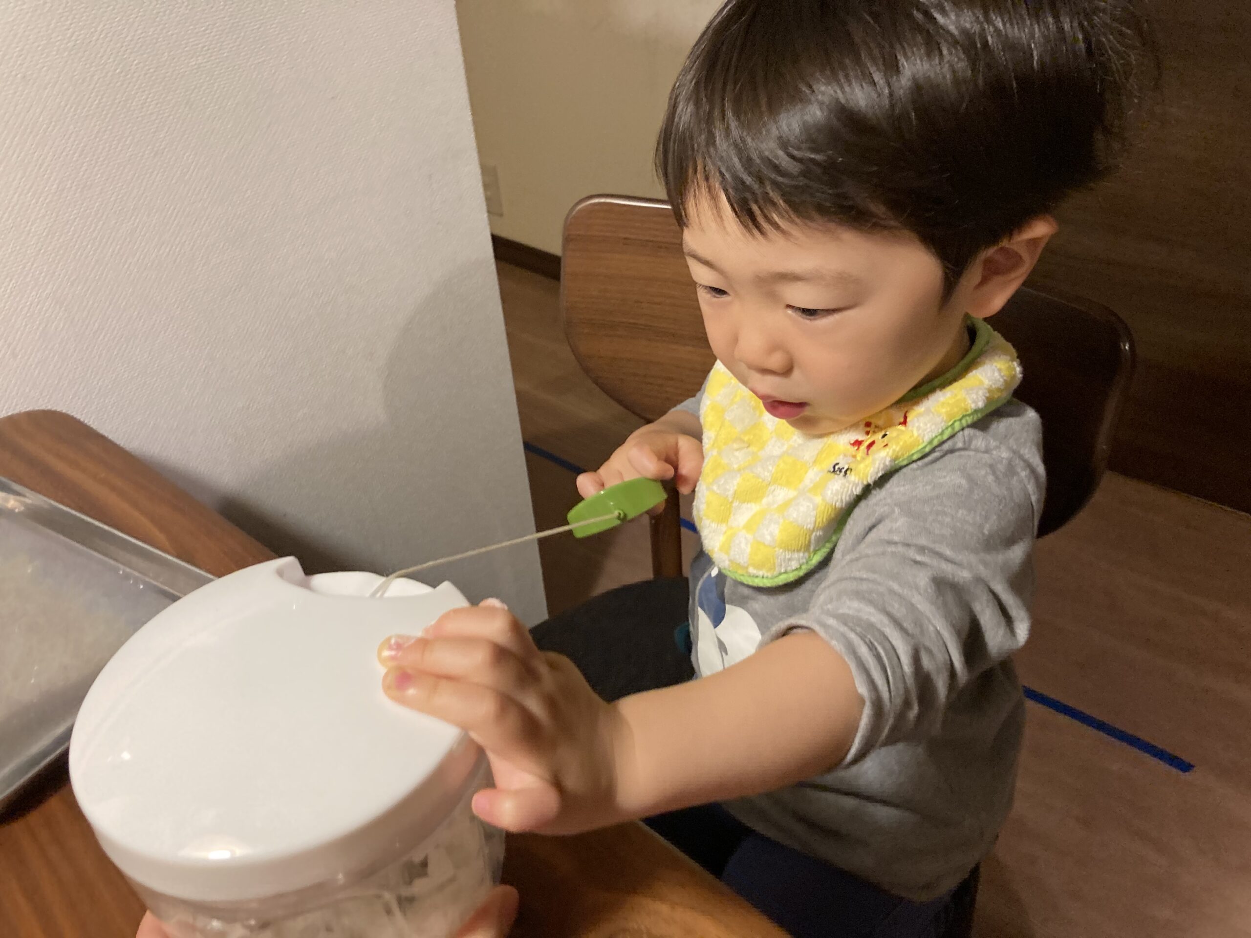 我が家の息子はミートローフ作りをした際(2歳0か月)にはゆっくり戻すことは全くできず、むしろ「バチンッ」と戻ることを楽しんでいる様子でしたが、今回(2歳2か月)は、するするっと戻すことができました!