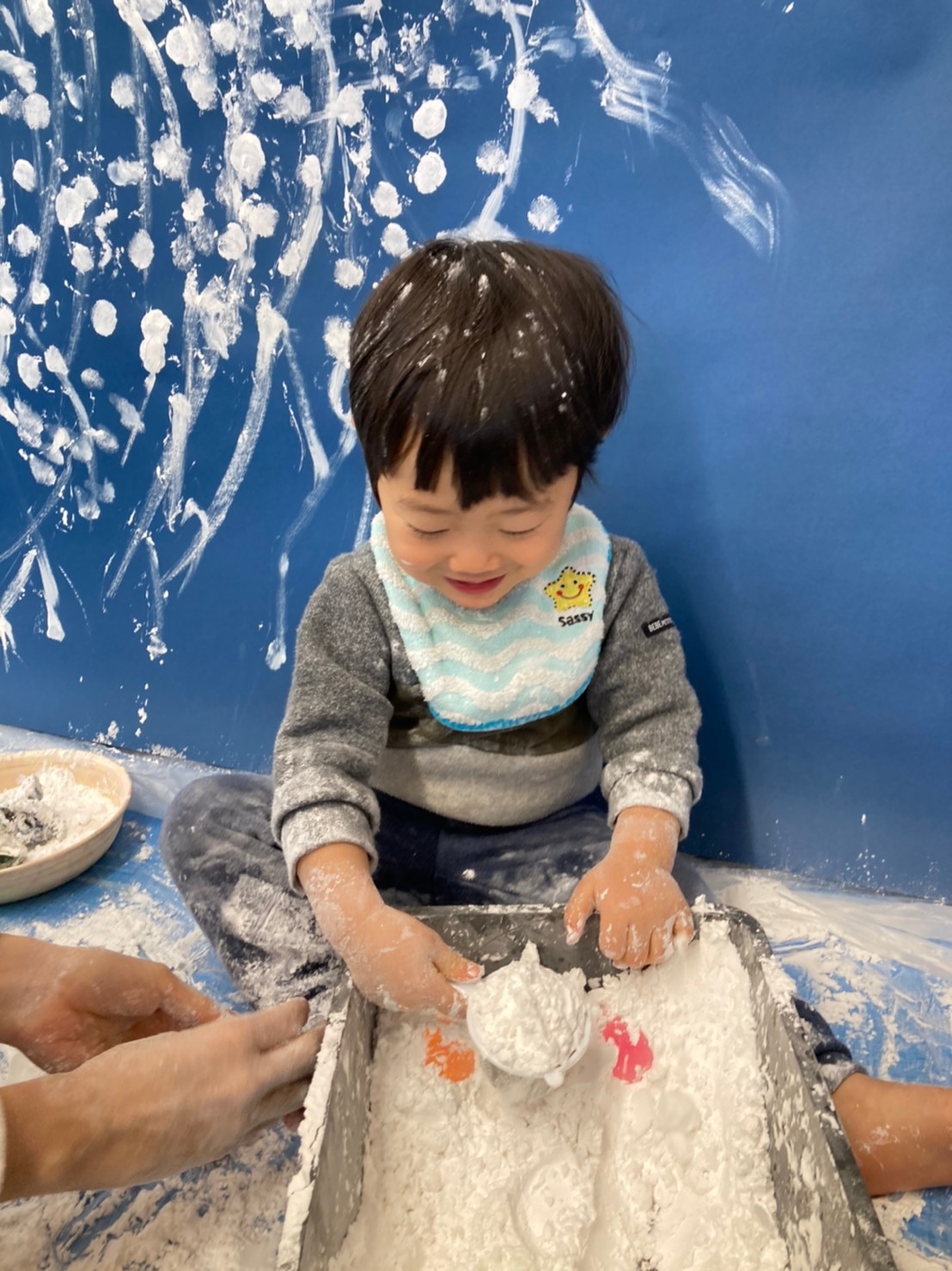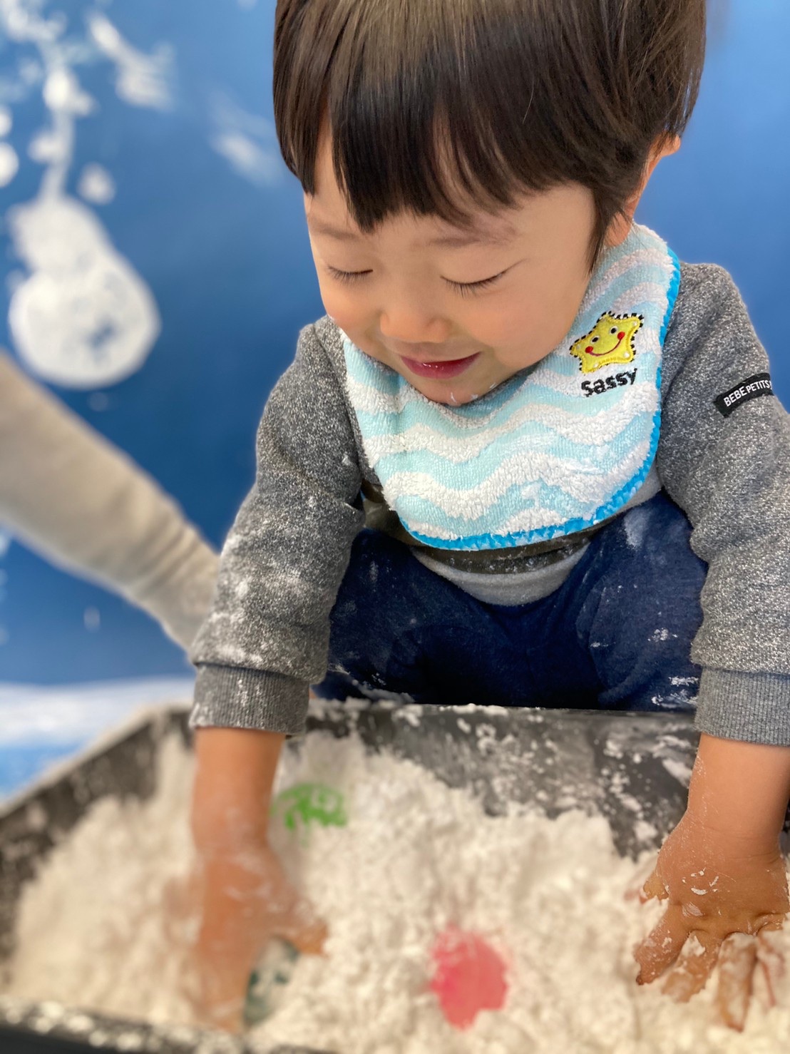 話は逸れますが、我が家ではここ1年程ぐちゃぐちゃ遊びに通っています。ぐちゃぐちゃ遊びでは、絵具やクレヨン、新聞紙など、様々な素材を使いますが、その中に片栗粉を使って雪を描くプログラムがあり、参加したことがあります。片栗粉を触る感覚は、大人でも気持ちよく、とても楽しかったので、ご興味ある方はぜひ調べてみてくださいね。