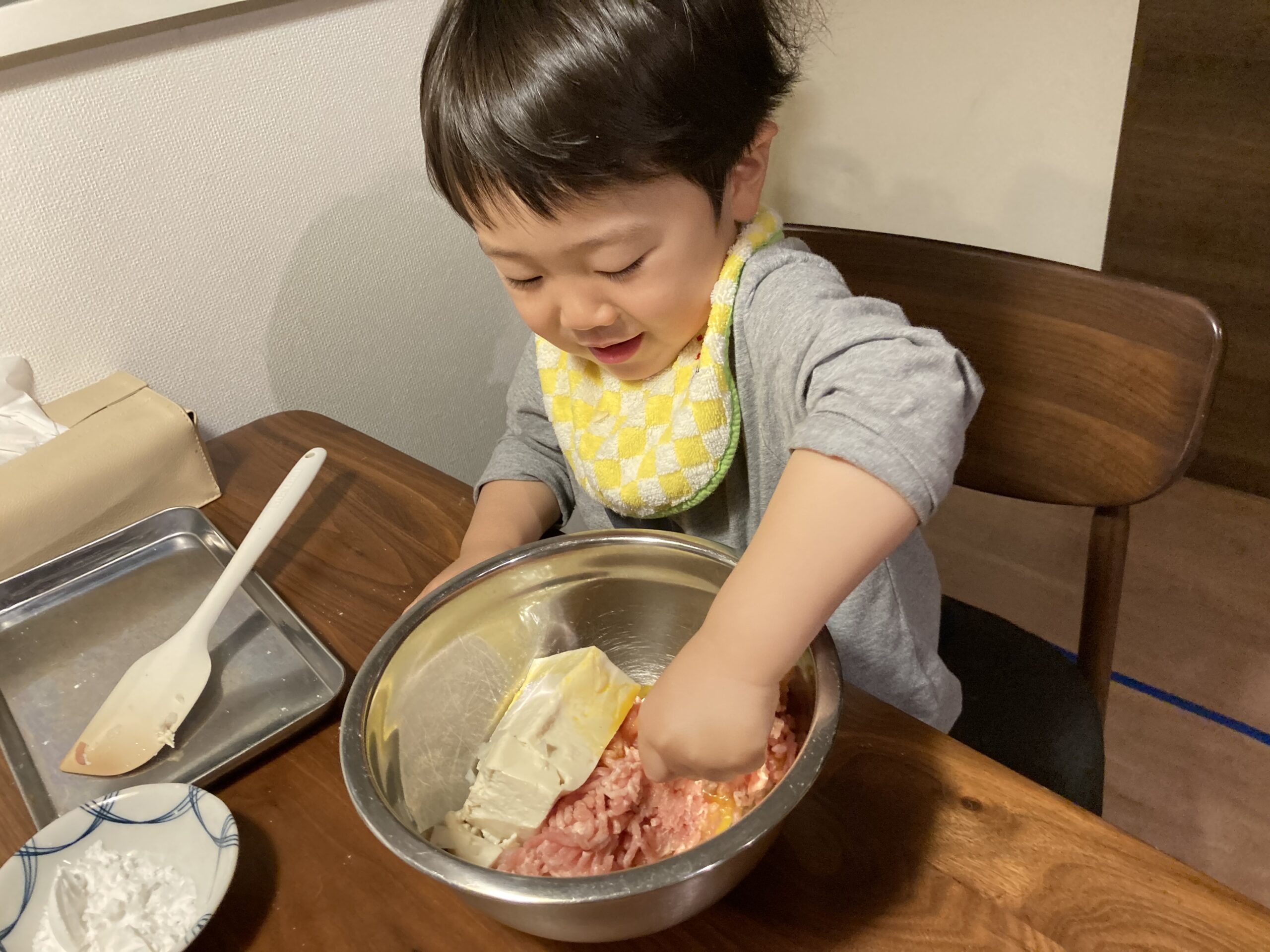 今回は、2歳頃からこどもと一緒に楽しむことができる豆腐ハンバーグ作りを紹介します。2歳2か月の息子とチャレンジしました。無理せずお子さんが興味を持った活動をお手伝いしてもらい、お料理を楽しみましょう♪