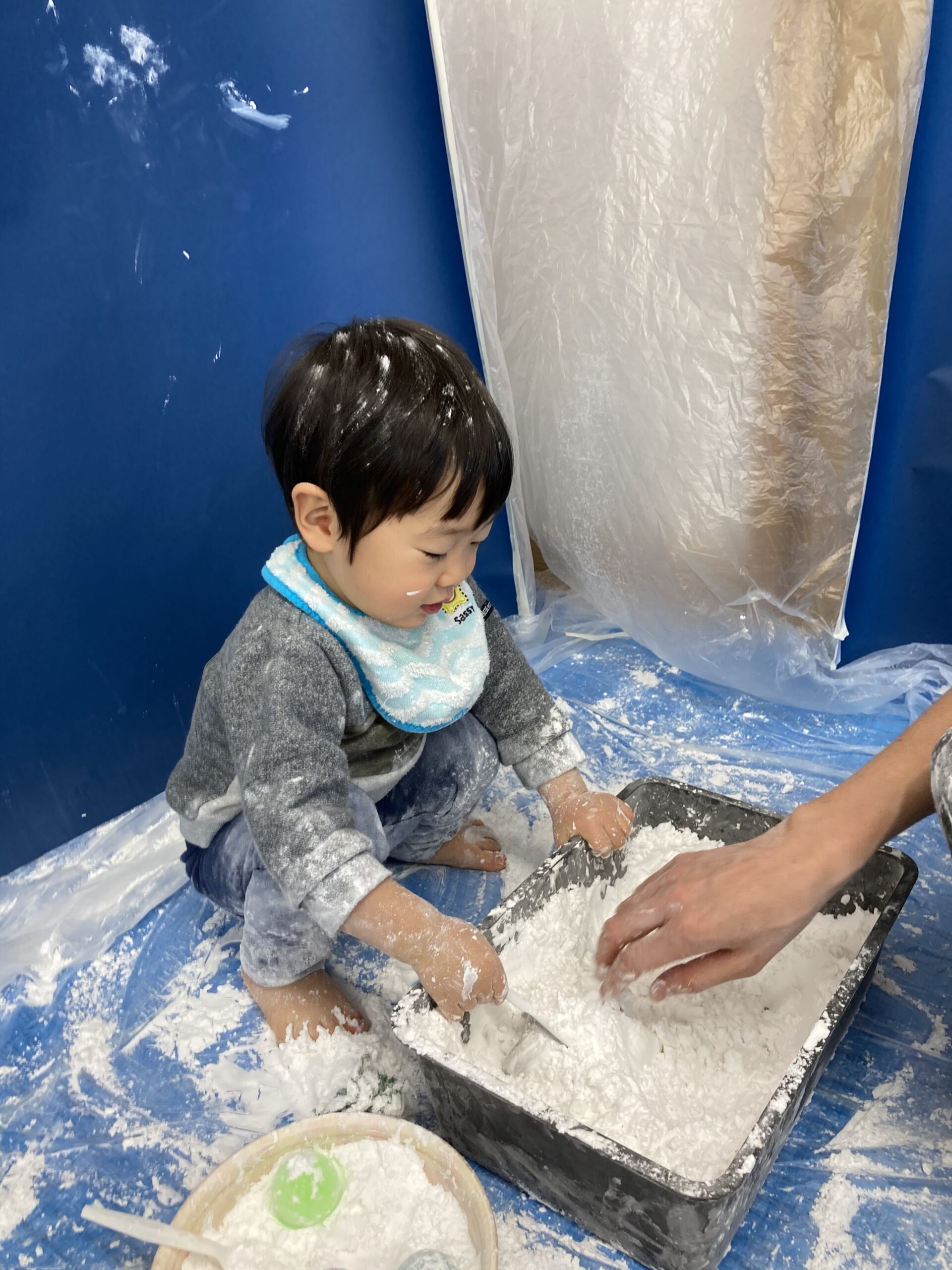 我が家の息子(2歳2か月)は今回は片栗粉を少しづつつまんで入れることを楽しんでいました。