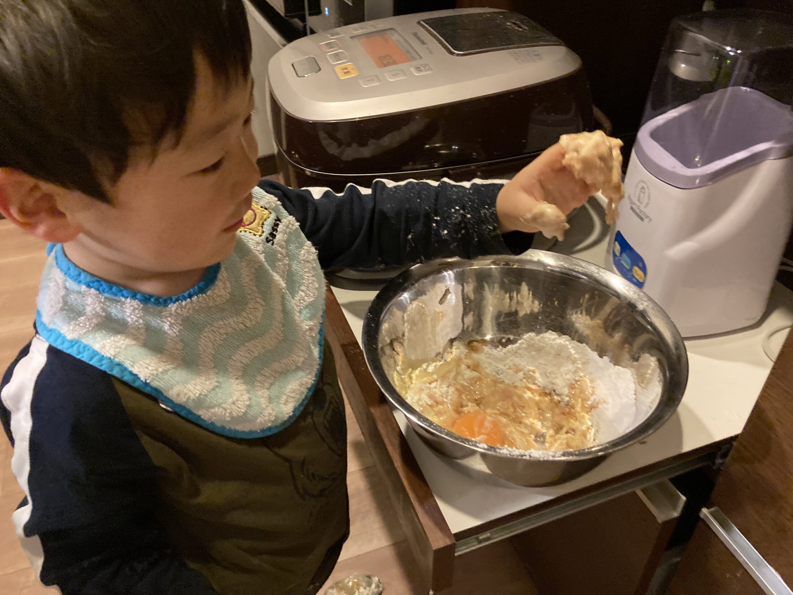 最近は、お料理が好きになってきた様子の息子。実はこの作業をする前は駄々をこねて泣いていたのですが、材料をセッティングした途端やってきて、笑顔で取り組んでくれました(助かった。。)。
