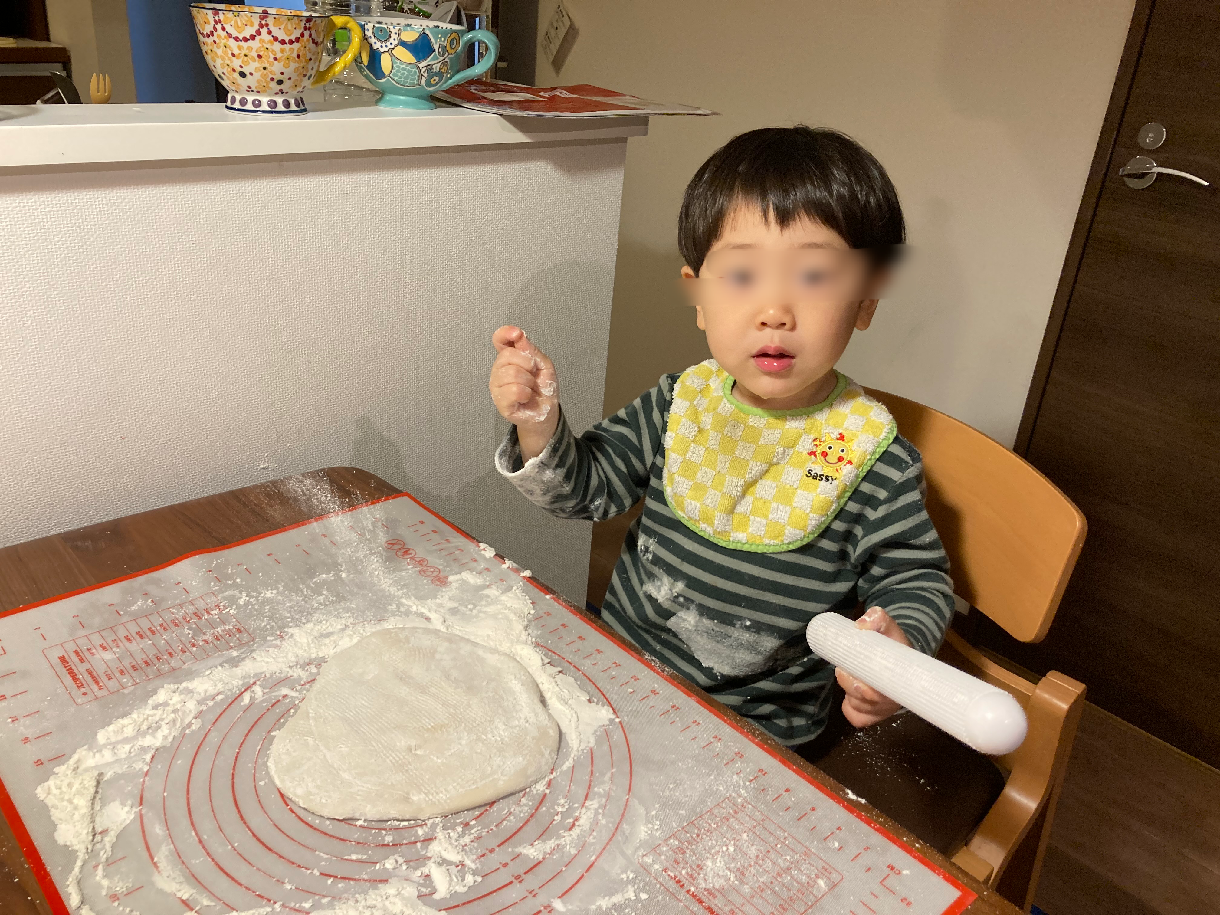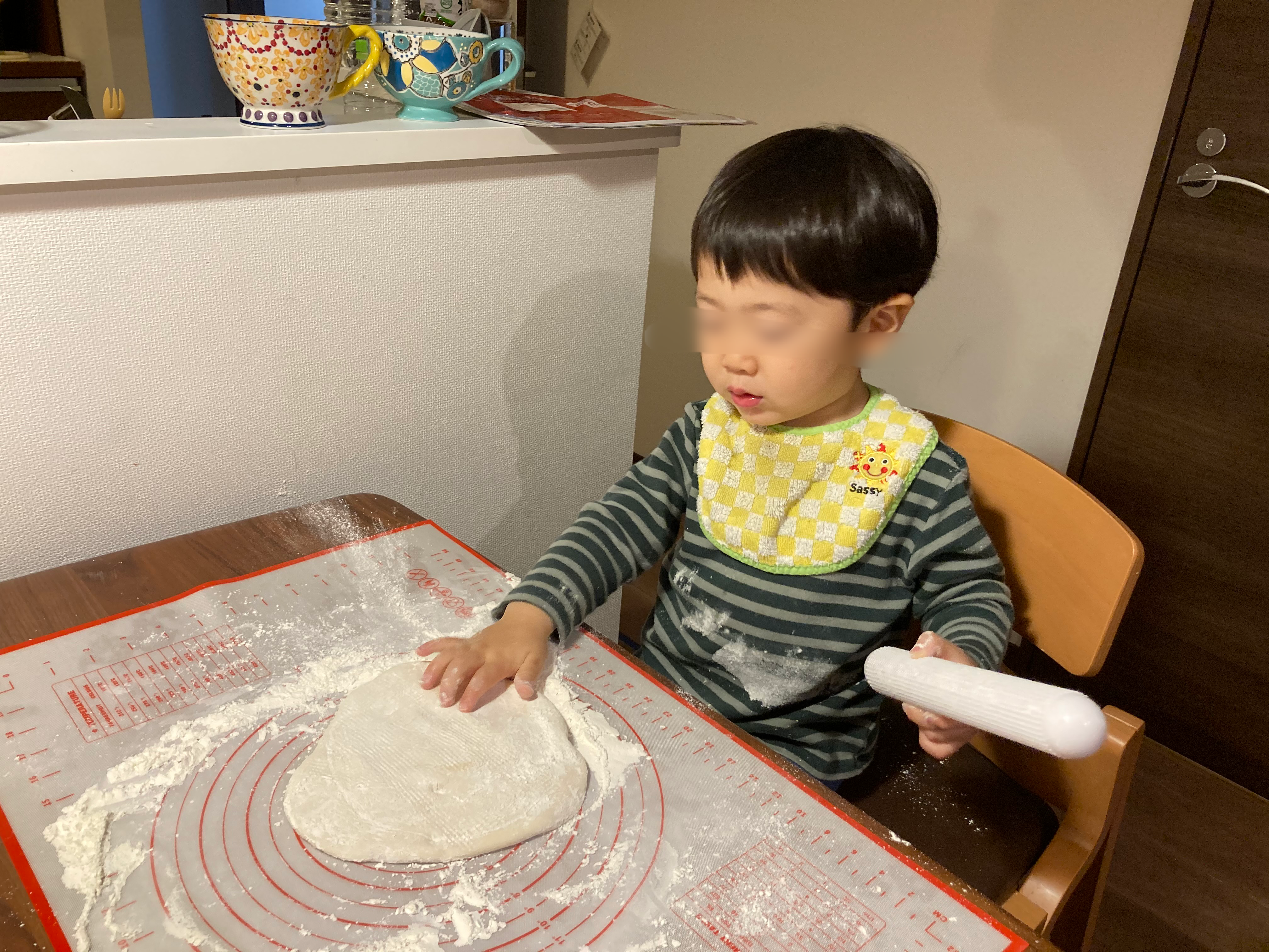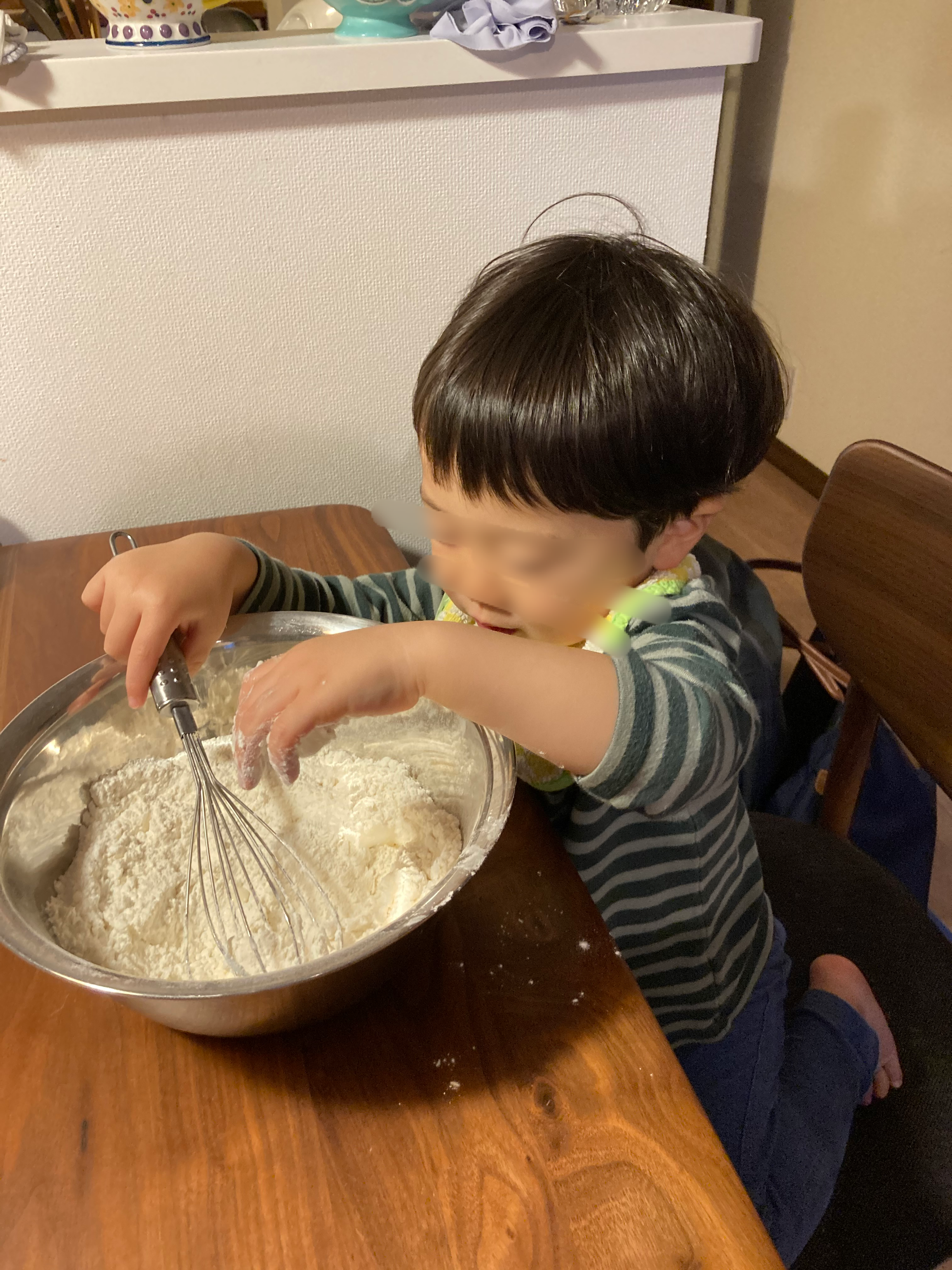実は今回、粉に水を加えるところからお手伝いしてもらおうと計画したのですが、これは失敗。我が家の息子(2歳2か月)はボールの中で混ぜずに粉をまき散らし始めてしまい、大惨事に。。