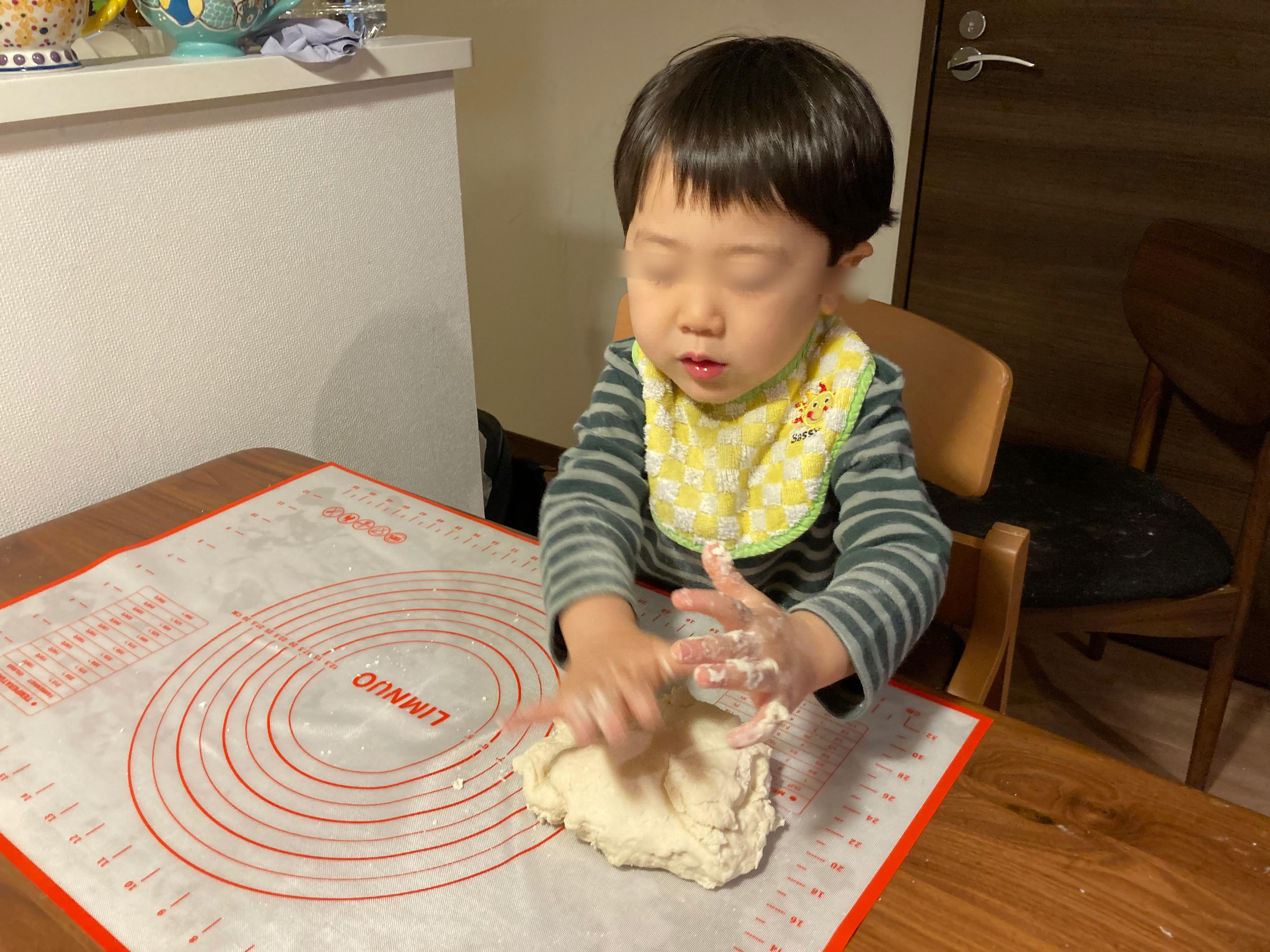ちなみに作業中に使っているシリコンマットは、パン作りやピザ作りの回でもご紹介した、シリコンマットです。このシリコンマット、薄いのにテーブルにピタッとくっつくので、こどもが作業をする時も作業がしやすいようです。