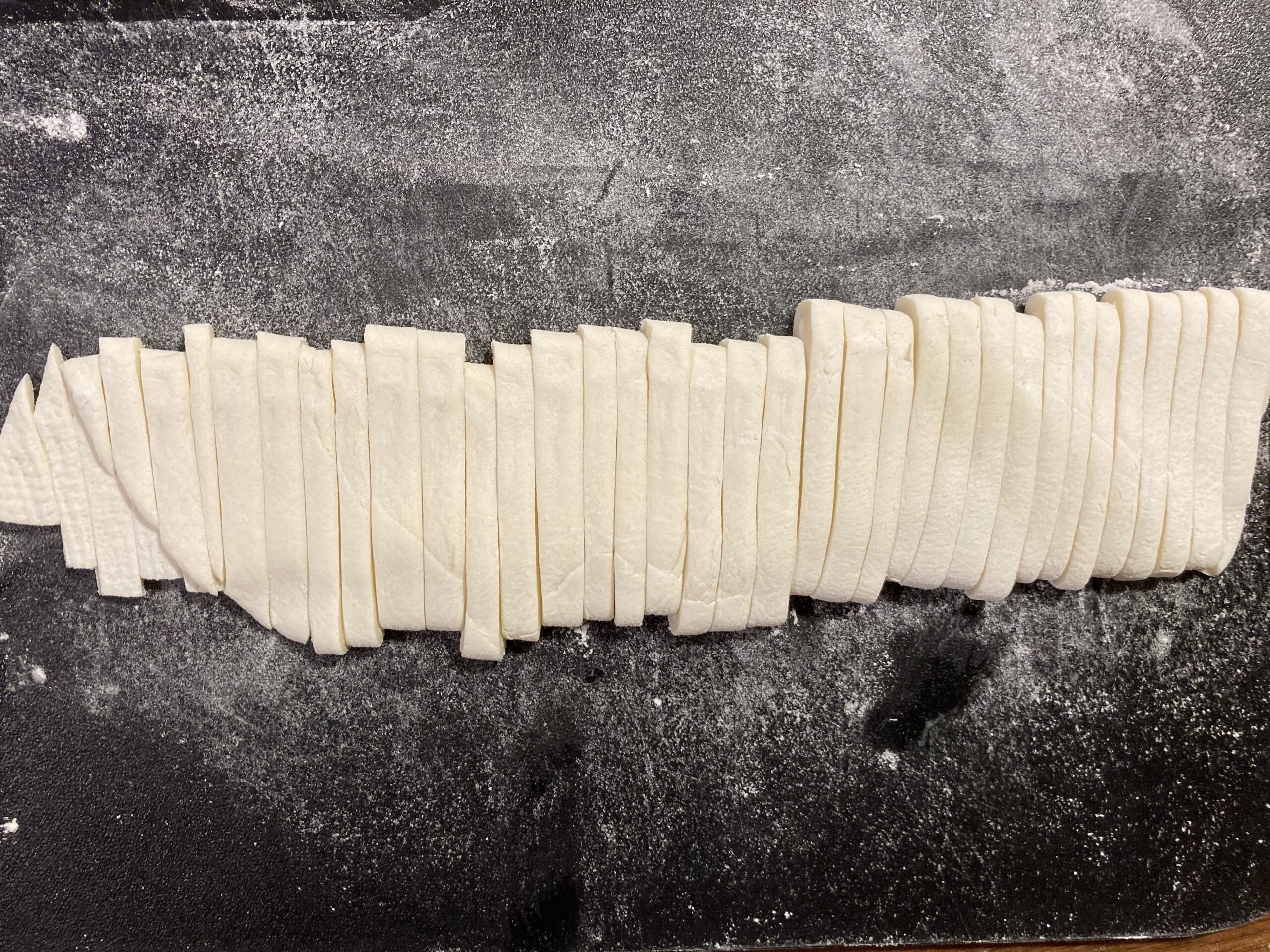 ⑥伸ばした生地を折りたたみ、食べやすい太さに切ります。
