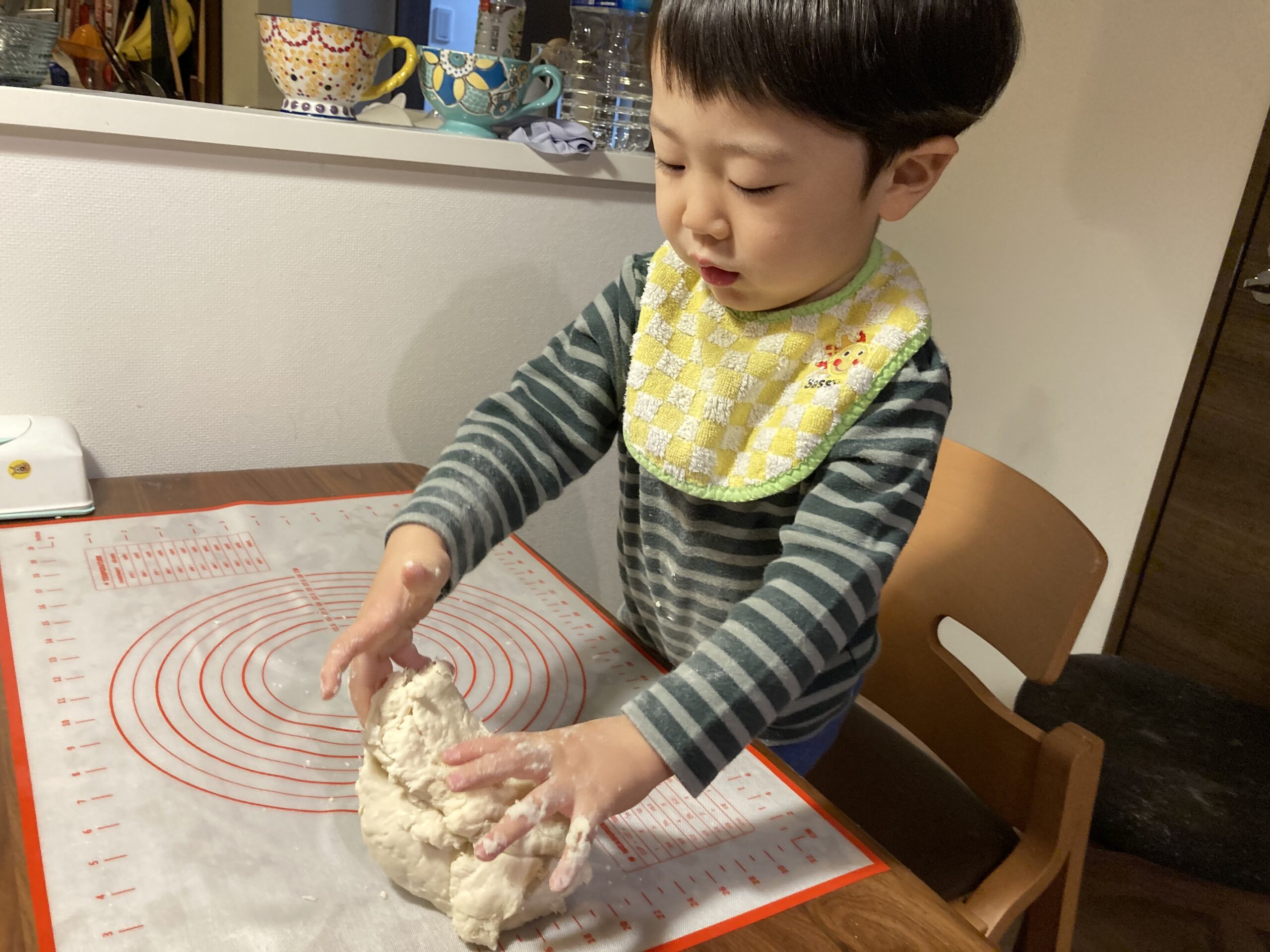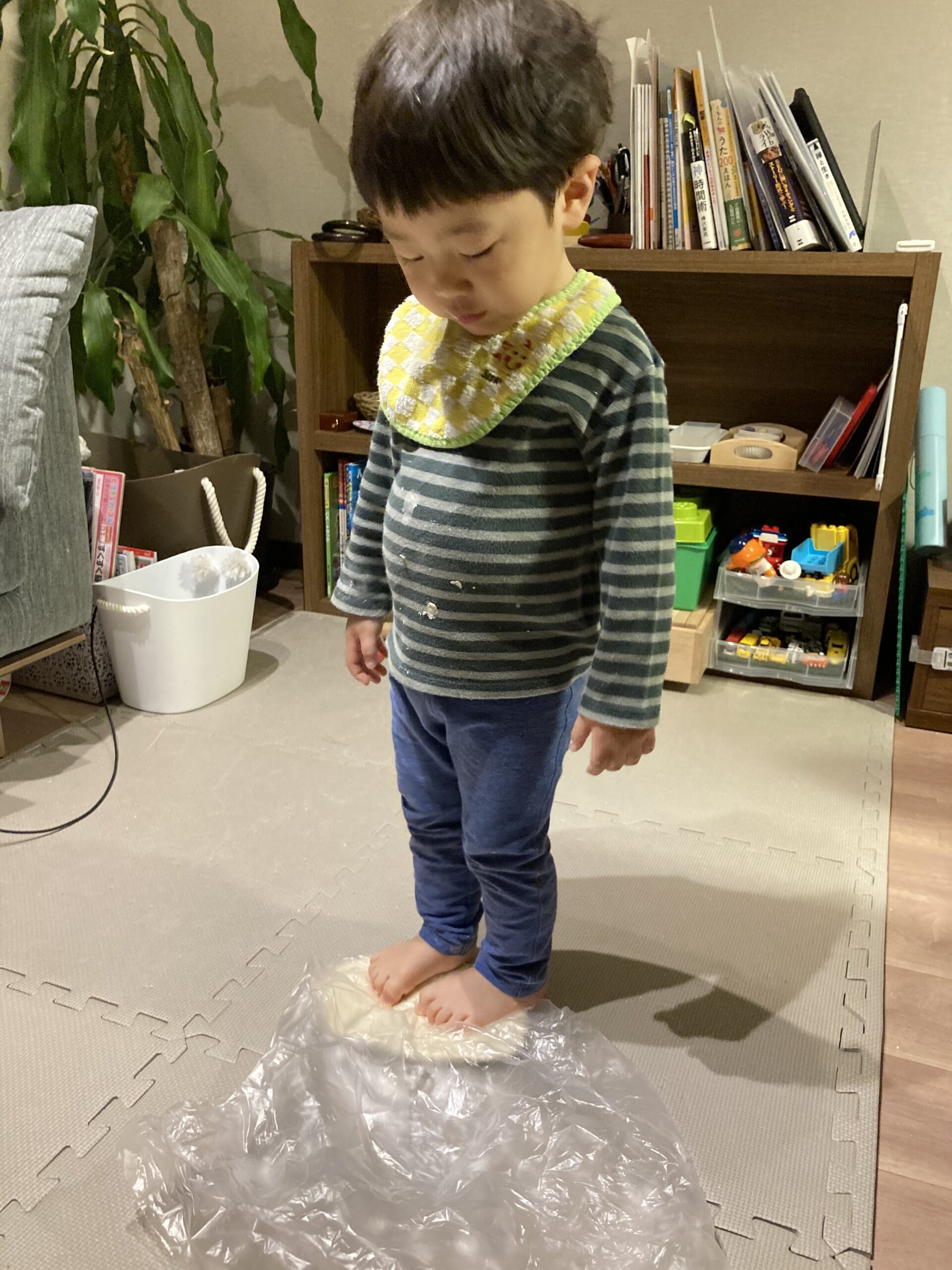 手でこねたあとは、さらに足で踏んでいきます。踏む動作が登場するお料理はなかなかないですよね、我が家の息子(2歳2か月)も最初は不思議そうに踏んでいました。足で生地を踏む感覚は大人でも面白く、15分もあっという間に過ぎていきますよ。