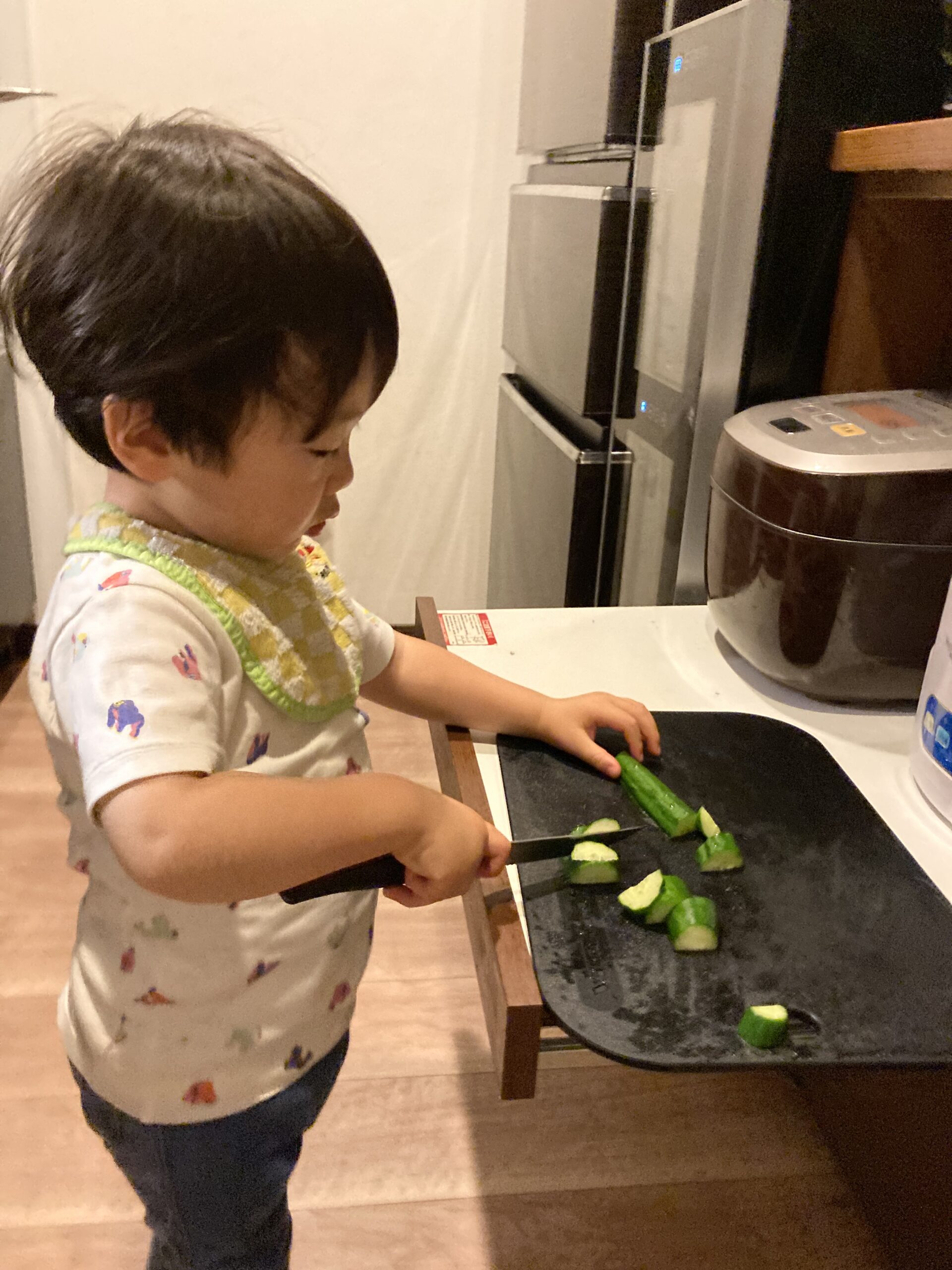 まだあまり包丁は使ったことがない息子。以前にチョコバナナマフィンを作った以来、バナナは時々切っていましたが、きゅうりは初挑戦です。