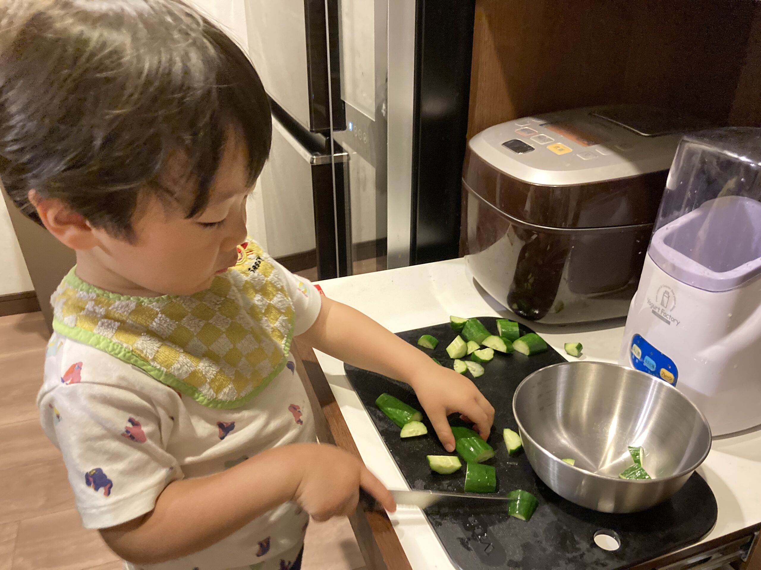 そこで今回は、きゅうりを包丁で切るお手伝いをしてもらいました♪